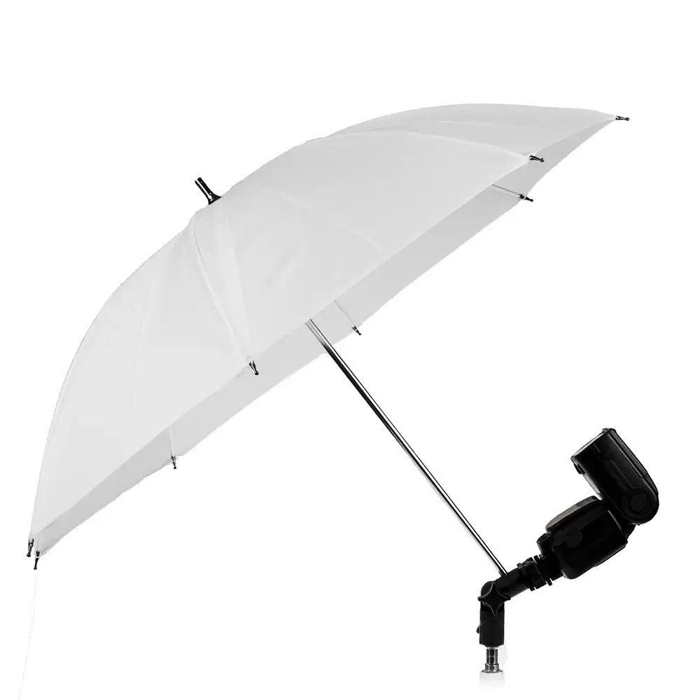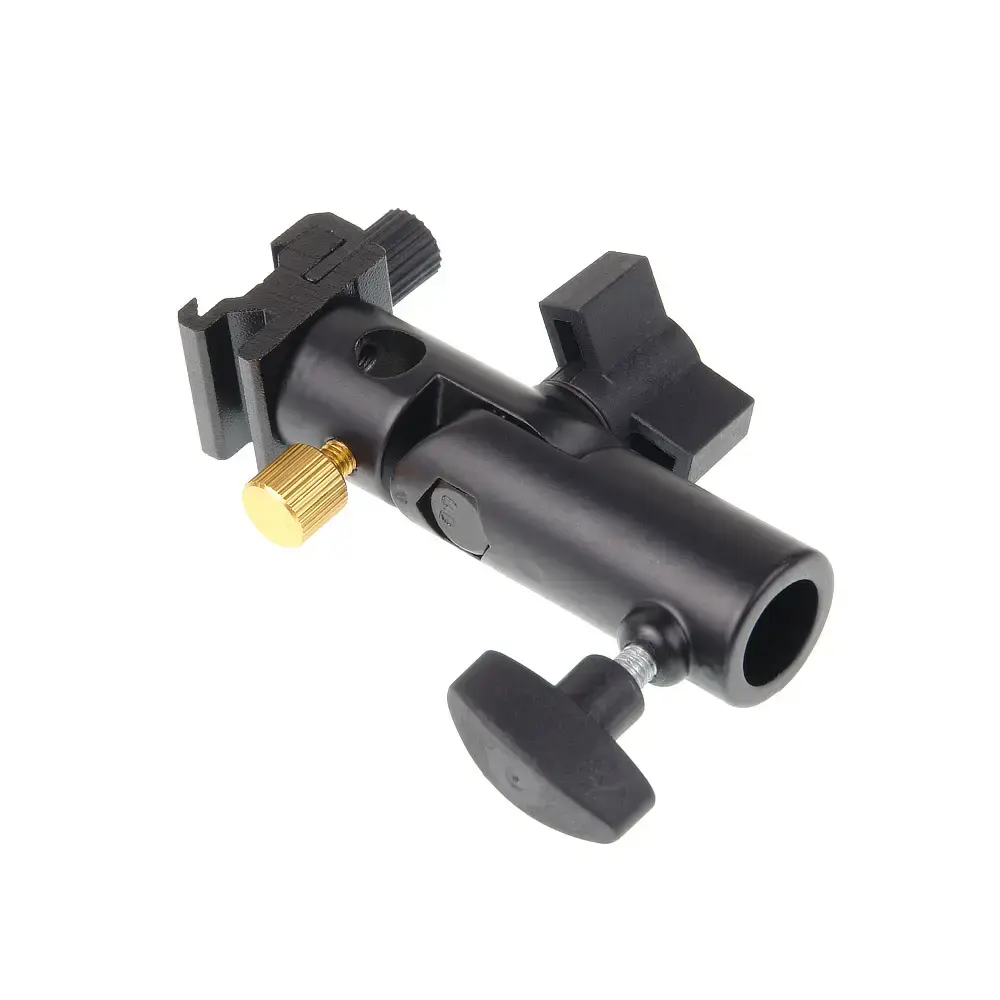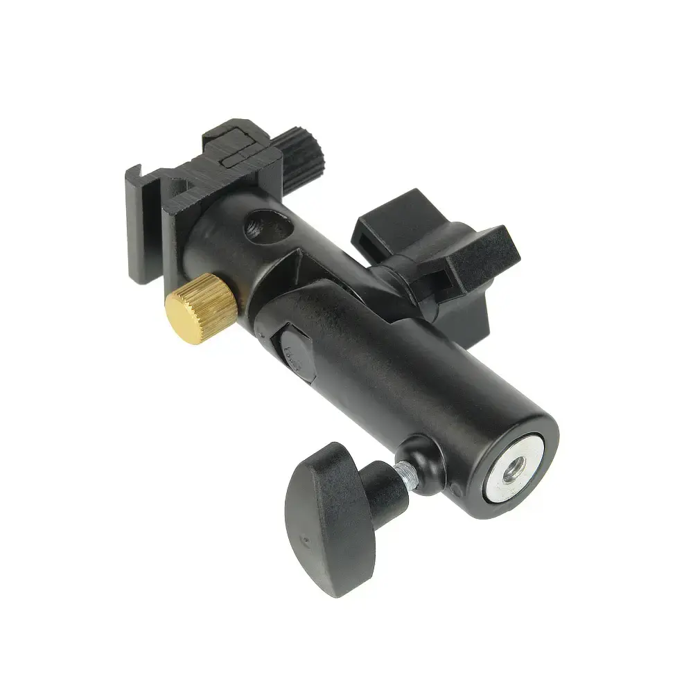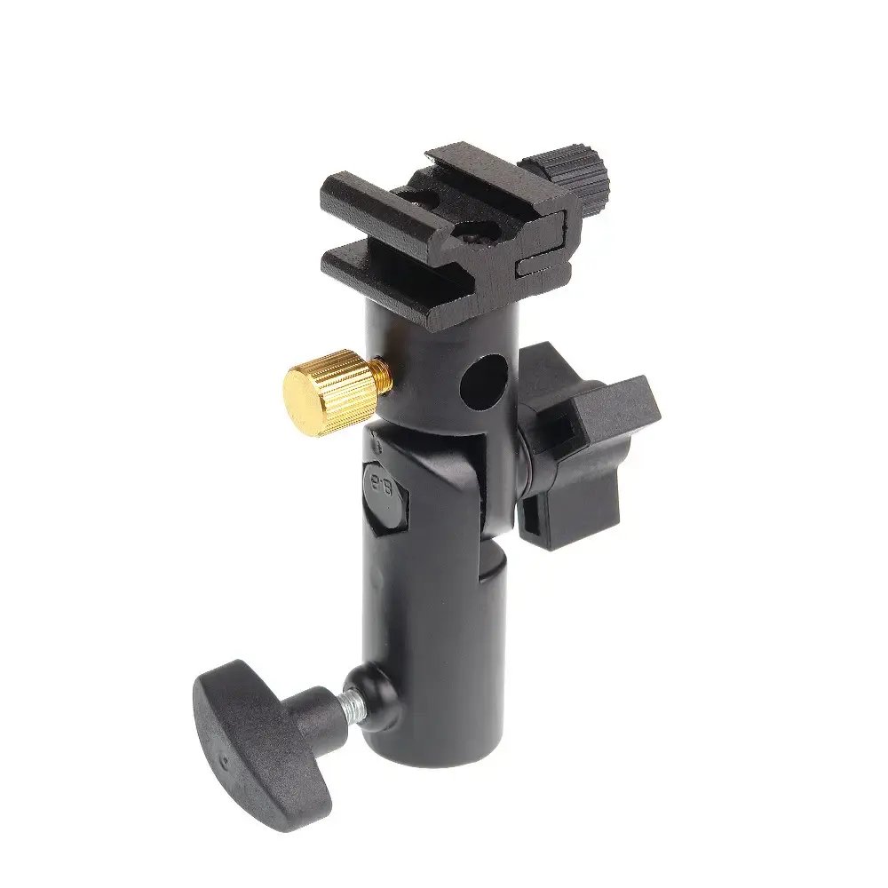 Зажим Е предназначен для установки зонта и вспышки с креплением «башмак» на стойку со шпиготом 5/8", винтами 3/8" и 1/4".