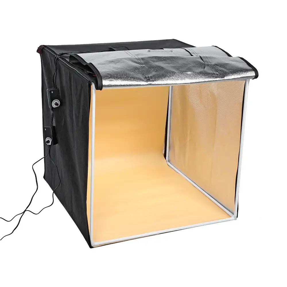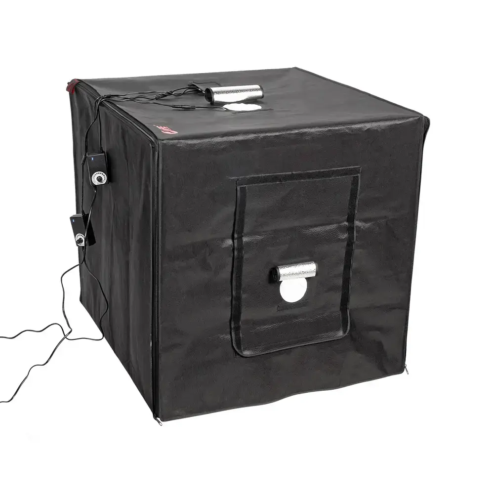 Основой фотобокса служит тент, который натягивается на жесткий сборный каркас из трубок, соединенных между собой пластиковыми уголками. Объект, помещенный в фотобокс, освещается равномерно благодаря серебристой светоотражающей ткани тента и источникам света в самом фотобоксе. Освещение с цветовой температурой 5600 (±200) К обеспечивают 288 светодиодов: 4 планки по 72 источника крепятся к каркасу фотобокса фиксаторами.
