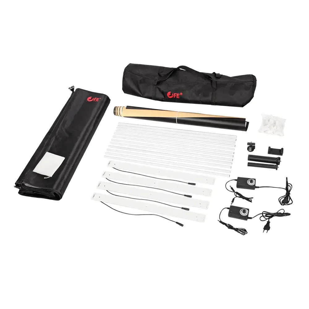 Компактность фотобокса в сложенном виде и сумка-переноска размером 77х18х18 см обеспечивают удобство работы на выезде. Вес комплекта в сумке 4 кг.