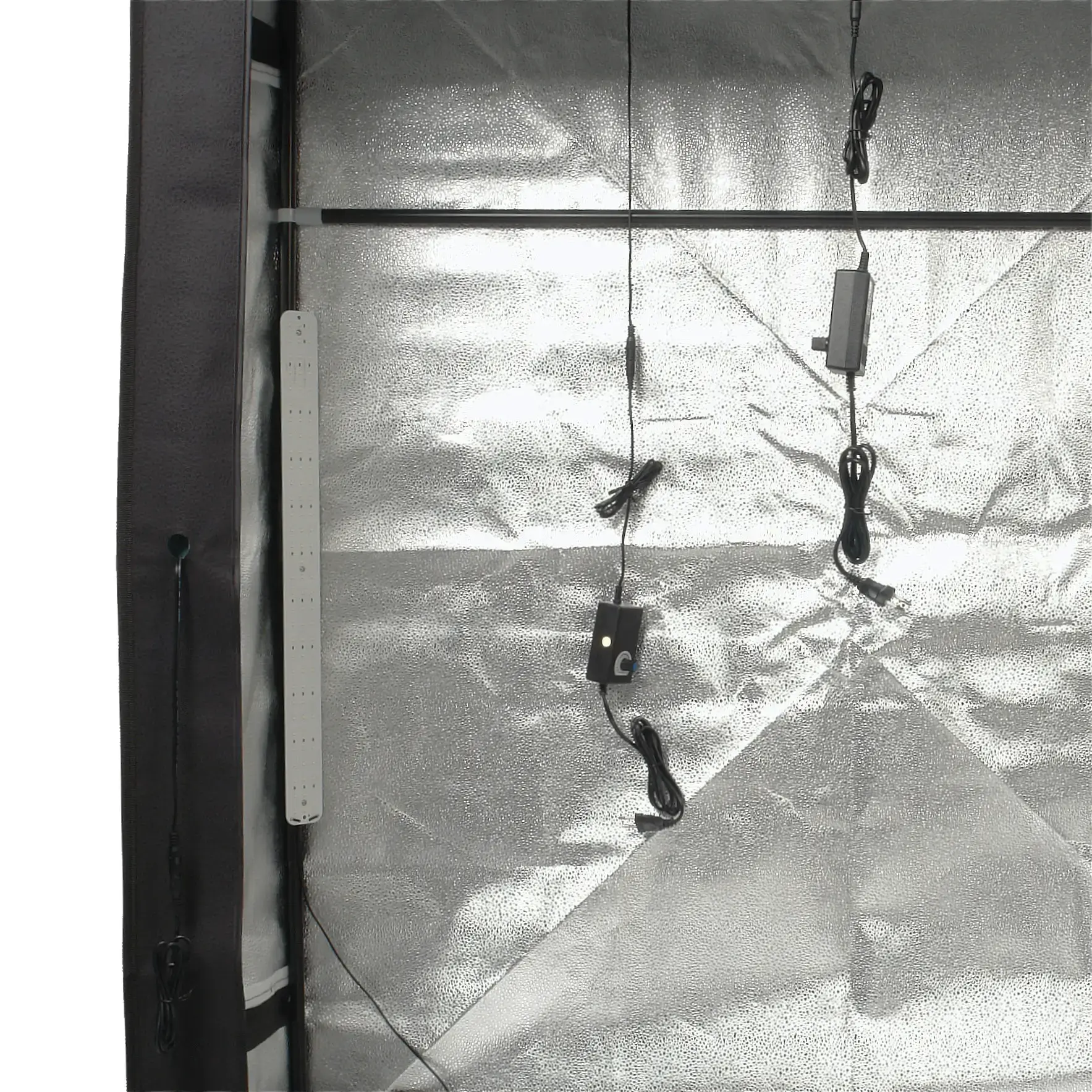 Светодиодные осветители крепятся на трубки каркаса с помощью мощных магнитов по двум боковым и одной верхней грани фотобокса. Питание светодиодных линеек осуществляется от сетевого адаптера, провод к которому продевается в отверстии тента. К одному адаптеру подключается две линейки одновременно. Для создания заполняющего света от линеек в комплекте предусмотрены два рассеивателя, крепление которых осуществляется к трубкам каркаса за счёт металлических крючков на резинке.