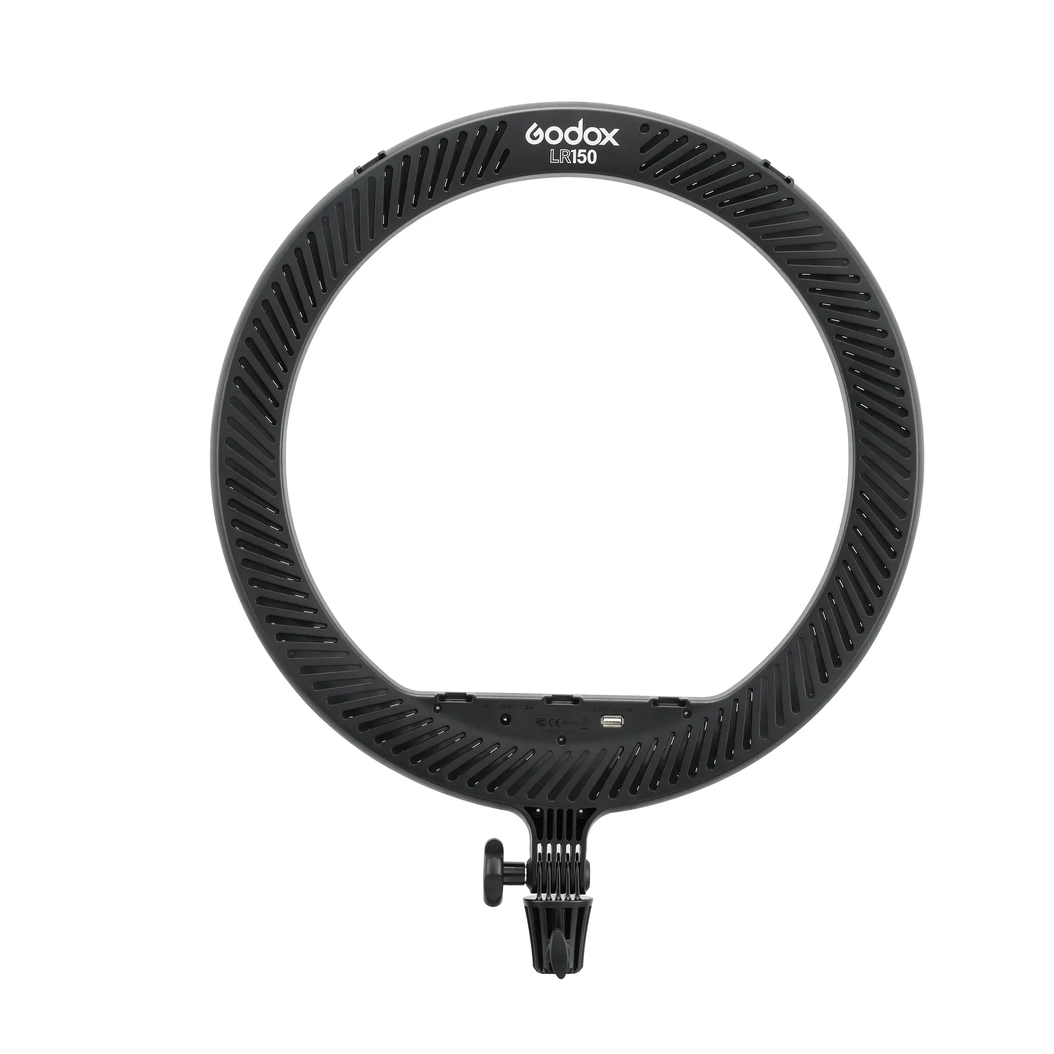 На корпусе осветителя LR150 находится порт USB для подзарядки смартфона. Благодаря дружелюбному интерфейсу и легкости, эти кольцевые осветители очень популярны и просты в использовании.