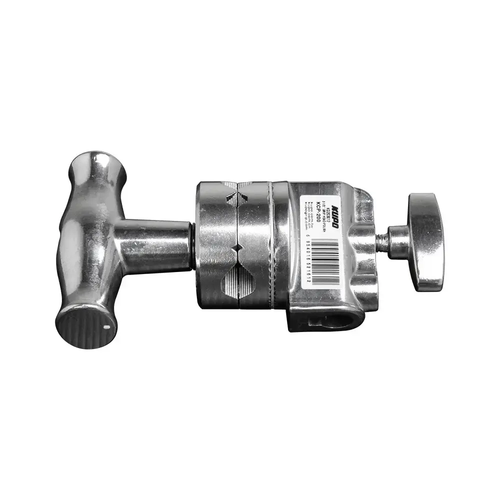 Головка KUPO KCP-200 2-1/2" GRIP HEAD (также известная как gobohead) представляет собой пару вращающихся алюминиевых дисков для зажима трубок различного диаметра, прикрепленных к двустороннему приемному гнезду 5/8" (16 мм). Диски оснащены четырьмя V-образными тисками разного размера для крепления любых аксессуаров с 5/8", 1/2", 3/8" или 1/4" крепежными штифтами или трубками. V-образные зажимы имеют зубцы, которые надежно захватывают все, что установлено между пластинами. Головка оснащена эргономичной Т-образной рукояткой увеличенного размера и подшипниками, обеспечивающими максимальный крутящий момент. Между двумя частями головки расположен алюминиевый диск с нескользящим зубчатым сцеплением, благодаря которому обеспечивается прочность фиксации и точный контроль. Стальной центральный болт зафиксирован в отлитой из алюминия части головки, на которой находится втулка 5/8", на резьбу болта накручивается массивная рукоятка, обеспечивая высокую прочность и долговечность. Головка 2-1/2" чаще всего используется в сочетании с удлинительной штангой grip arm, обеспечивая широкие возможности для установки различных аксессуаров, таких как флаги, скримы и шелка, а также других аксессуаров практически в любом месте.