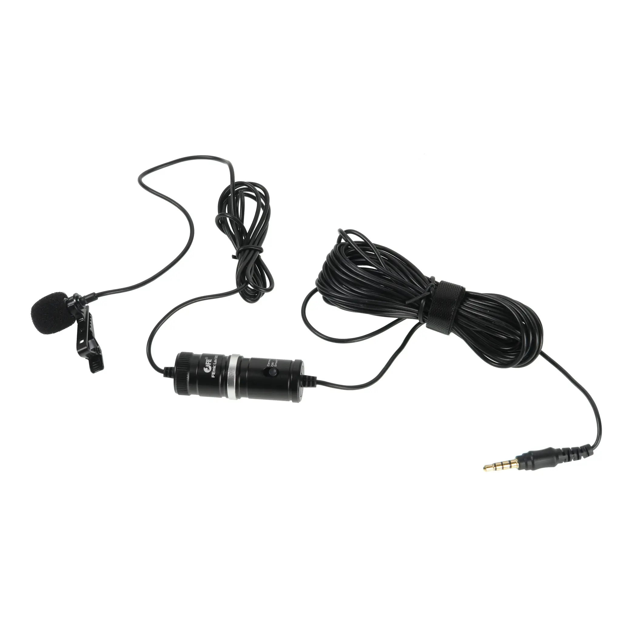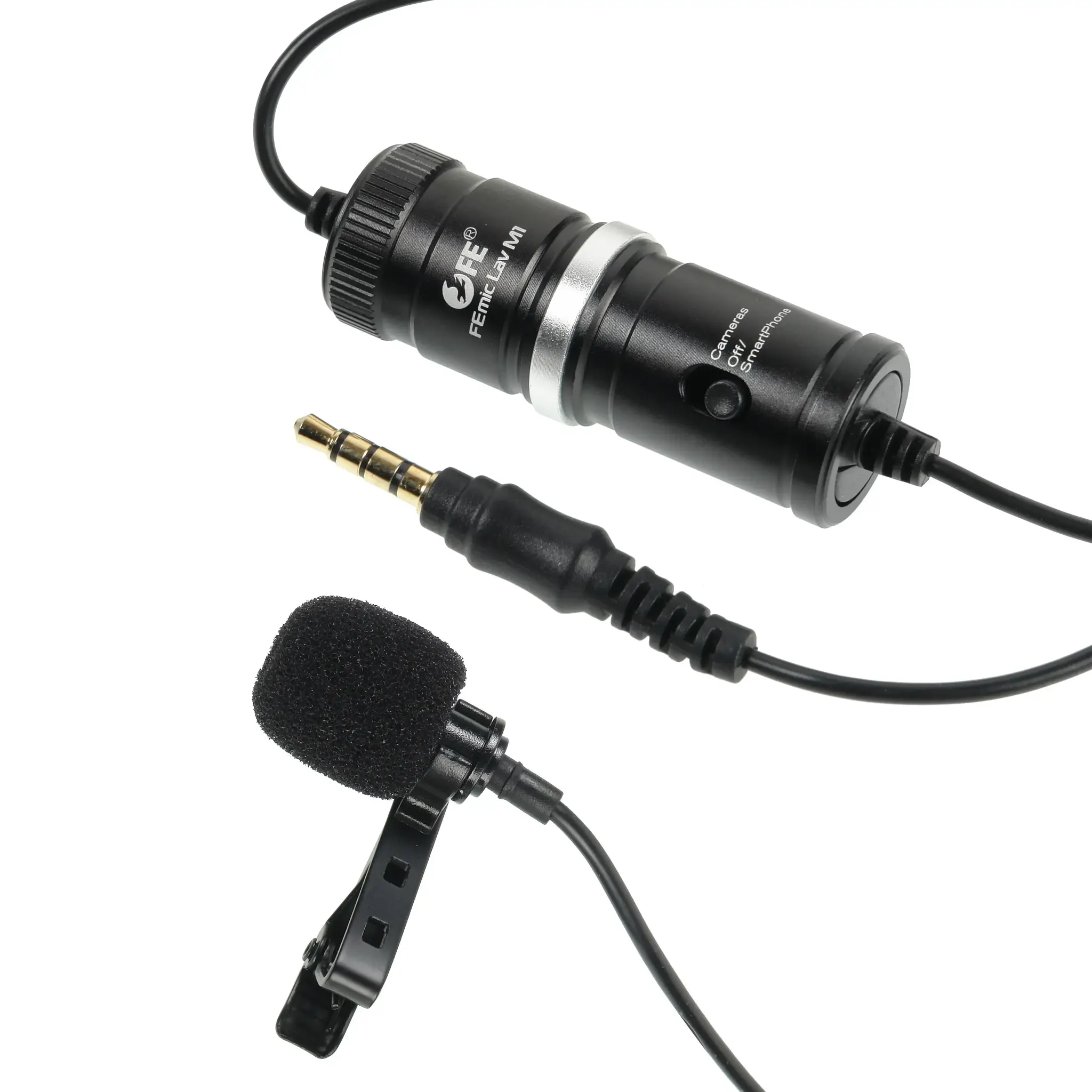 В комплект входит петличный конденсаторный микрофон с частотным диапазоном 20-160000 Гц, соотношением сигнал/шум ≥55 дБ и кардиоидной направленность. Однонаправленный петличный микрофон предназначен для четкой синхронной записи речи во время съемок прямых эфиров, интервью, лекций, презентаций или любых других живых выступлений с одним выступающим. Кабель микрофона длиной 6 метров со штекером TTRS 3.5мм на конце позволяет пользователю свободно перемещаться и значительно удаляться от камеры, сохраняя при этом отличное качество звука. Микрофон может незаметно крепиться к одежде при помощи комплектной металлической клипсы. Поролоновая ветрозащита снижает нежелательный посторонний шум ветра, шуршания одежды и т. д.