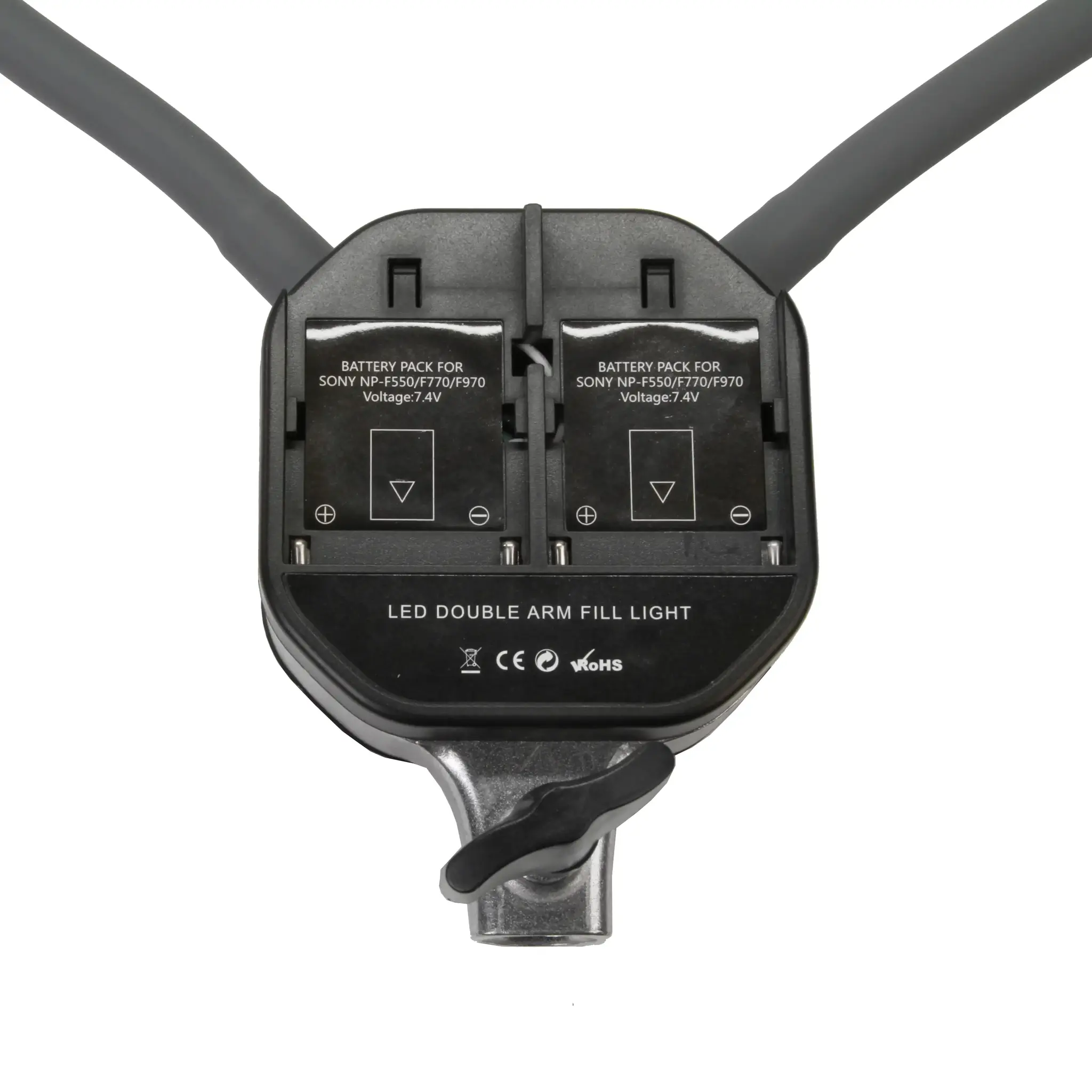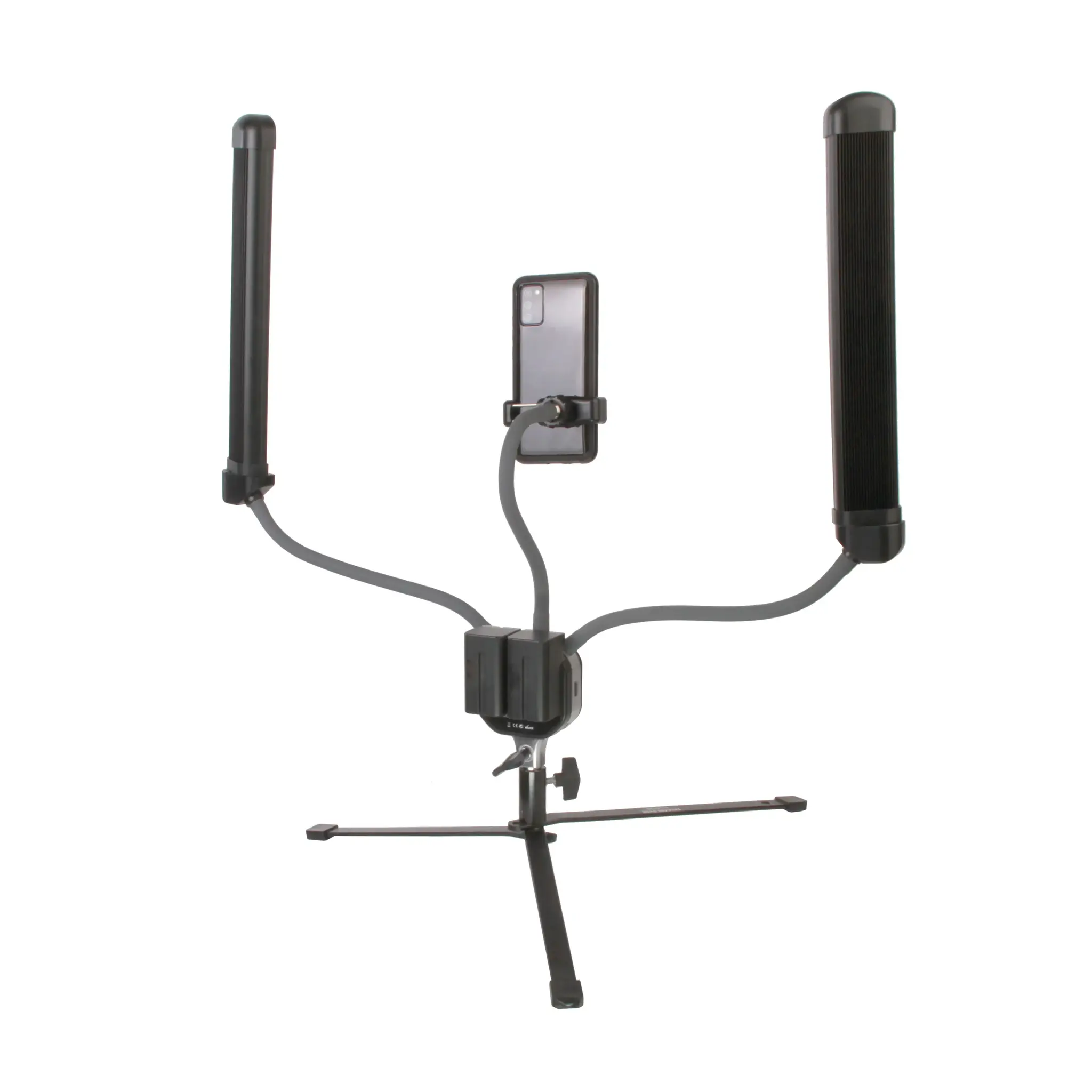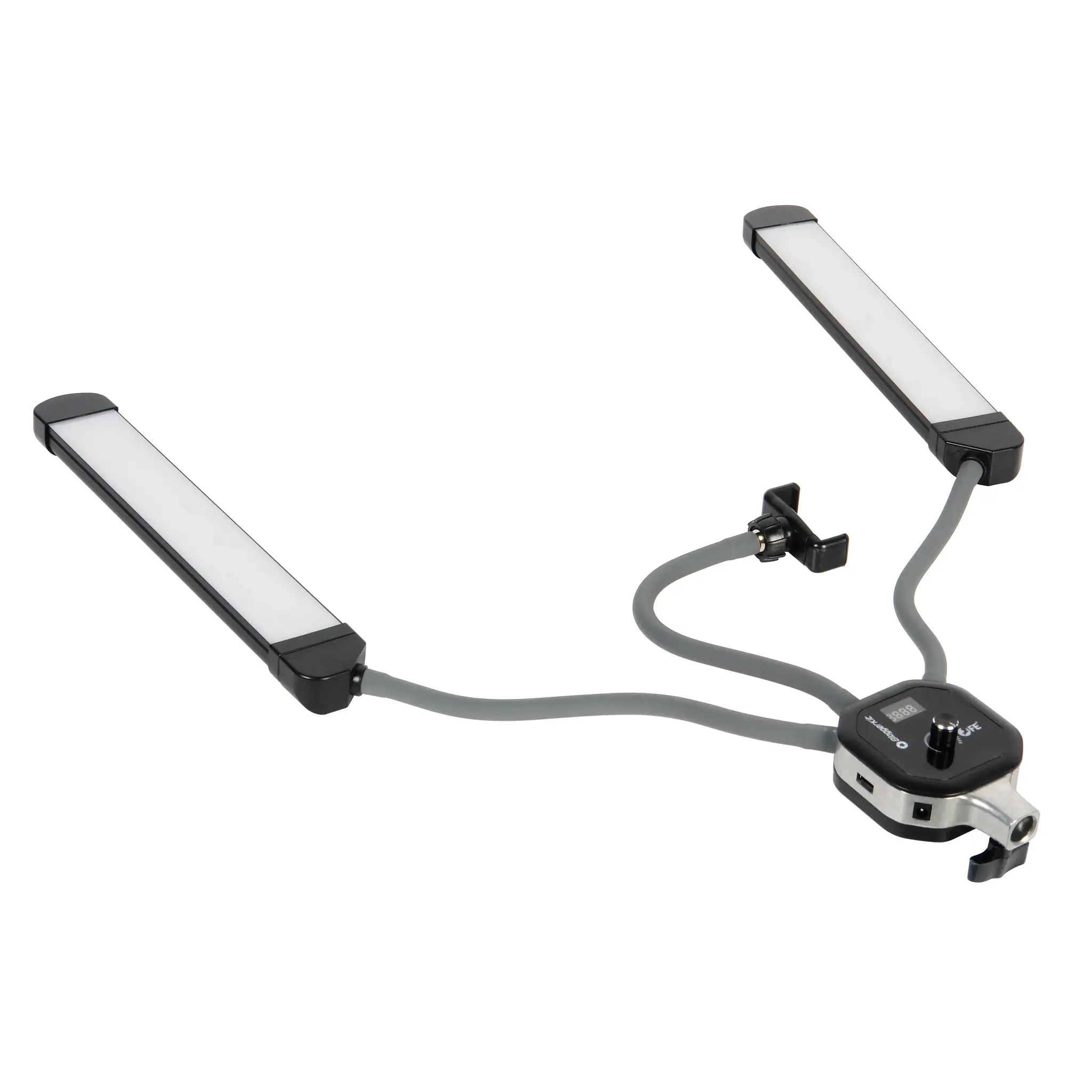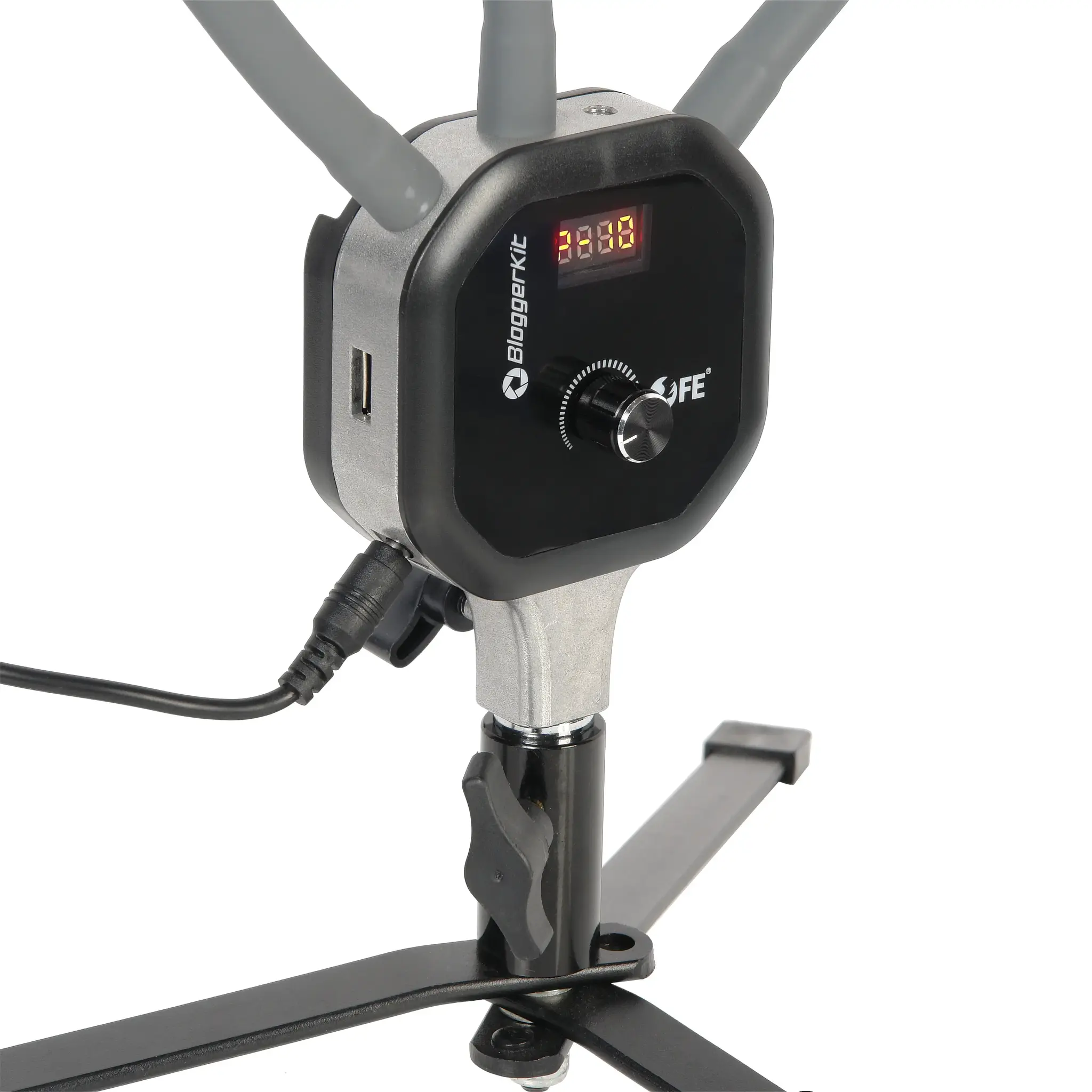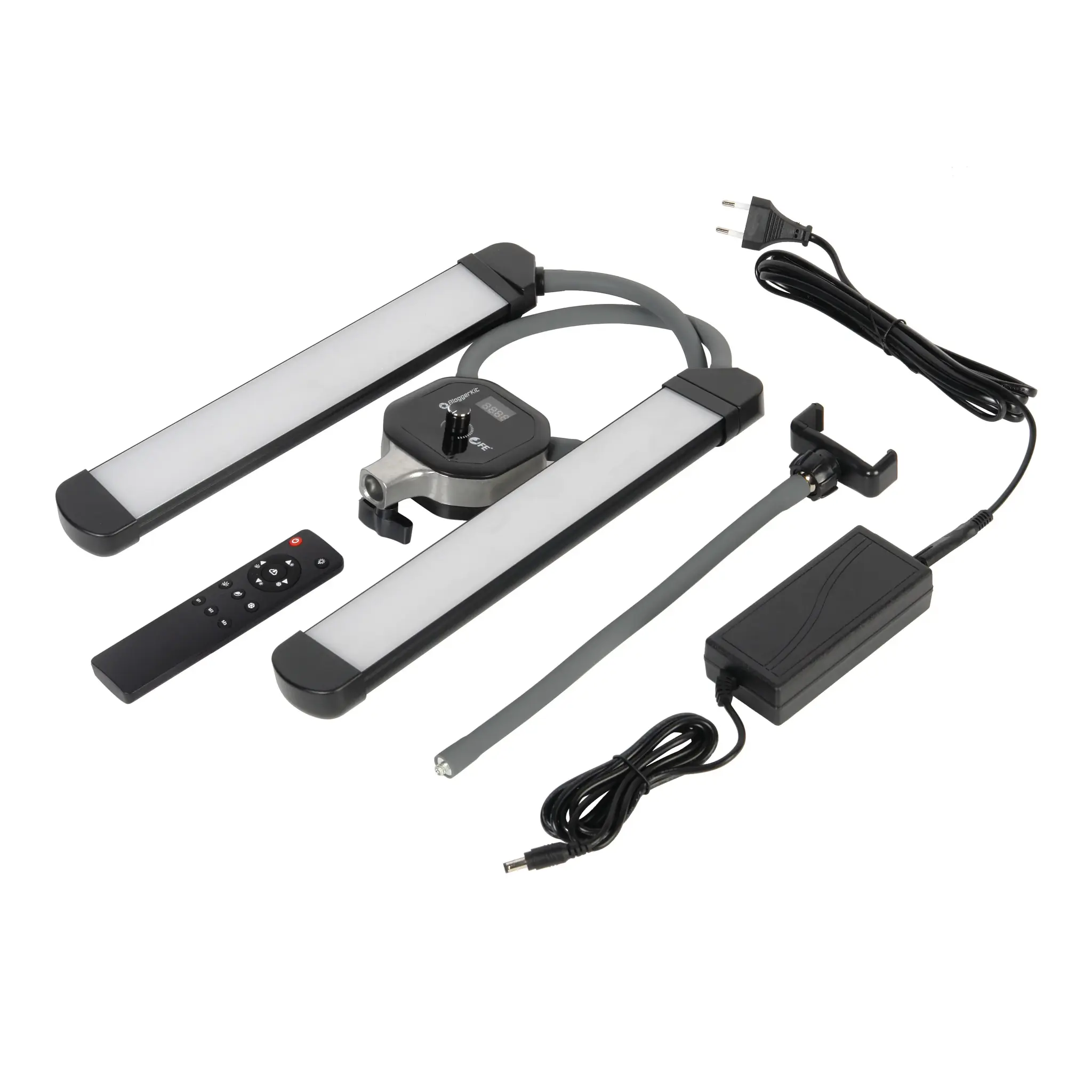 Осветитель светодиодный Falcon Eyes BloggerKit для фото/видеостудии Falcon Eyes BloggerKit – осветитель с двумя светодиодными панелями, блоком управления и держателем для смартфона. Может использоваться как источник заполняющего света при ведении видеоблога, стрима, съемок для соц.сетей, профессиональной предметной съемки. Две светодиодные панели с матовой рассеивающей поверхностью (4,9х28 см) обеспечивают мягкий световой поток с высоким индексом цветопередачи. Благодаря CRI > 94 изображение точно передает реальный цвет объекта. Общая мощность осветителя 40 Вт. Корпус каждой панели – ребристый алюминиевый радиатор – эффективно отводит тепло от мощных светодиодов, чтобы они без перегрева работали положенные десятки тысяч часов. Бесшумная система охлаждения не создает помех при записи звука. Блок управления с кнопкой-валкодером и дисплеем позволяет плавно регулировать цветовую температуру (3000–6000 К) и яркость (0–100%) освещения. Гибкие стальные штанги нужно изогнуть с определенным усилием, чтобы придать необходимый наклон источникам света. Штанги надежно удерживают выбранное положение и не меняют его под весом панелей. Каждую панель можно также поворачивать вокруг своей оси (максимально на 315°), регулируя тем самым интенсивность освещения отдельных деталей и выстраивая нужный светотеневой рисунок. Конструкция прибора будет удобна как DIY- или фудблогеру, которому нужно осветить поверхность стола и руки, так и фотографу, занятому предметной съемкой для каталога. BloggerKit вместе с панелями дает практически бестеневое освещение. Преимущества такого использования прибора особенно заметны при съемке прозрачных объектов и предметов удлиненной формы. Адаптер с подпружиненной лапкой рассчитан на смартфоны шириной от 56 до 86 мм. Адаптер крепится к съемной штанге с винтами 1/4”. Эту штангу, так же как штанги светодиодных панелей, можно изгибать под нужным углом. При необходимости на нее можно установить другое устройство с отверстием под винт 1/4”, например штативную головку, микрофон или дополнительный осветитель. USB-порт на блоке управления предусмотрен для питания смартфона. Для питания самого осветителя в комплект включены кабель и сетевой адаптер. Устанавливается на стойку со шпиготом диаметром 5/8". Стойка не входит в комплектацию. Питание осветителя может осуществляться от сети 220В (сетевой адаптер в комплекте) или от аккумуляторов NP-F (в комплект не входят) для чего на тыльной стороне панели осветителя предусмотрены 2 аккумуляторные площадки.