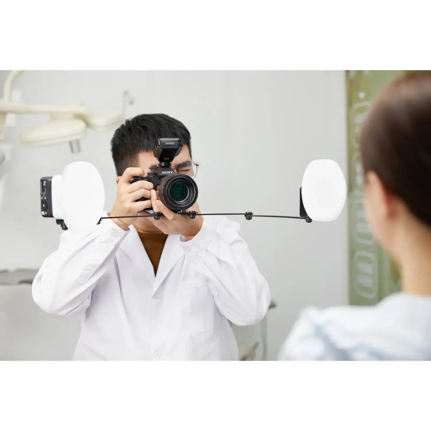 Специальный кронштейн Godox MF-DB для стоматологической макросъемки позволяет установить вспышки на расстоянии от объектива и более гибко регулировать их положение в горизонтальной плоскости. Такое расположение двух вспышек и возможность их поворота до 180° позволяет эффективно осветить труднодоступные участки в полости рта.