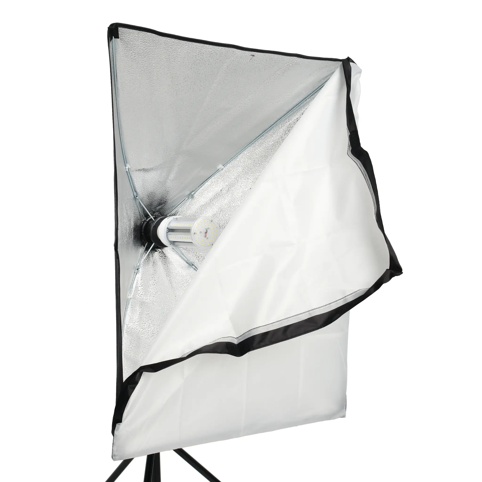 Прямоугольный несъемный cофтбокс размером 50х70 см и глубиной 50 см прикреплен к корпусу осветителя. Чтобы раскрыть софтбокса достаточно потянуть кольцо вверх. Купол софтбокса изготавливается из специальной синтетической ткани с серебристой светоотражающей внутренней поверхностью, используемый как рефлектор. В комплект софтбокса входит внешний тканевый рассеиватель, который одевается на передний край софтбокса и приклеивается на липучку.