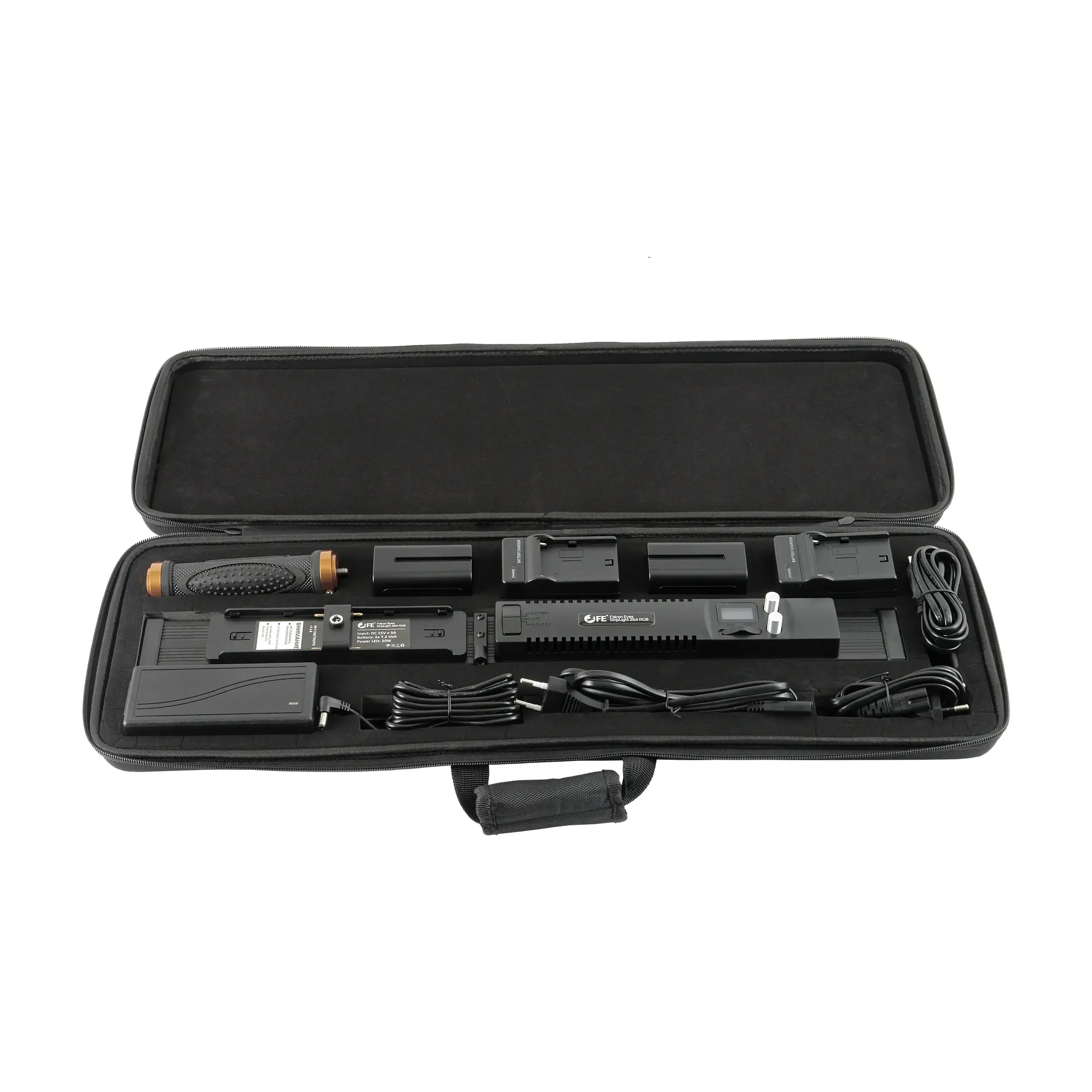 Осветитель в легком и прочном алюминиевом корпусе имеет размеры 532х58х35мм и вес всего 510 г. На корпусе размещено два резьбовых отверстия 1/4'' для закрепления комплектной рукоятки или установки на дополнительно приобретаемый держатель. Обрезиненная эргономичная рукоятка позволяет удерживать прибор в руке длительное время. Однако для использования во время многочасовых съемок, рекомендуем использовать осветительные стойки, например Falcon Eyes FEL-1900ST.0.
