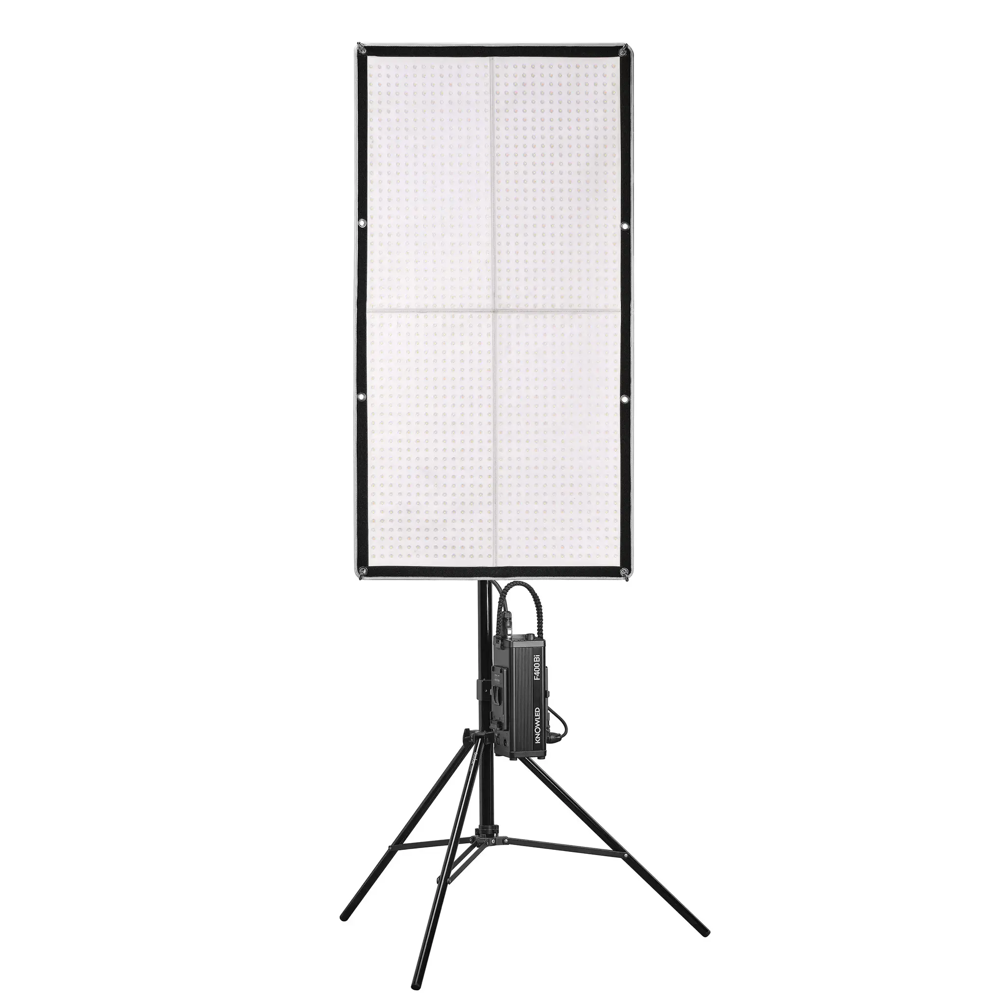 Панель осветителя F400Bi представляет собой гибкий, но прочный светодиодный коврик габаритами панели 121х63 см: для его установки не потребуется большая грузоподъемность стойки. Складная конструкция панели и удобный кейс позволяют удобно транспортировать прибор и экономить ресурсы на его доставку и монтаж.