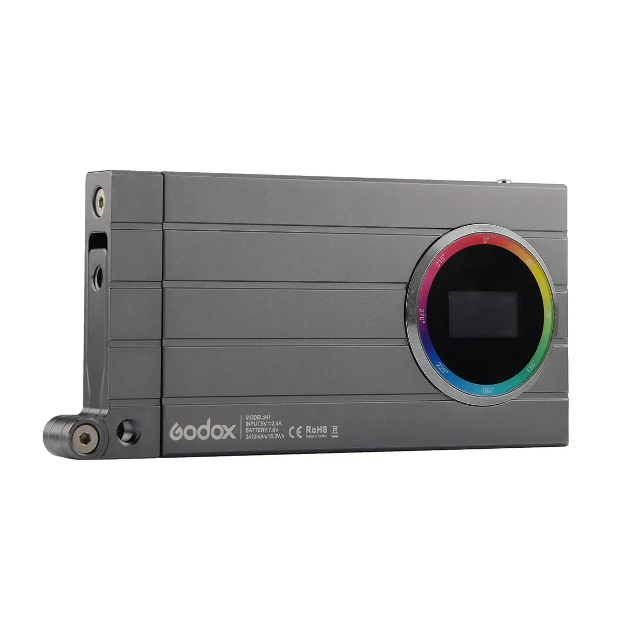 Осветитель Godox RGB Mini Creative M1 накамерный – светодиодная панель в легком алюминиевом корпусе, состоящая из 150 светодиодов (40х2 bi-color + 70 RGB) с мощностью 13Вт, для создания креативного освещения для фото- или видеосъемки. Компактный осветитель можно положить в карман и взять с собой на съемки куда угодно. Осветитель выдает яркий цветной свет с регулируемым оттенком и насыщенностью по шкале HIS в режиме RGB, или сбалансированный белый свет с регулируемой цветовой температурой от 2500 до 8500K. 15 предустановленных светоцветовых сценариев (40 вариантов) позволят имитировать динамические световые сцены – отблеск фейерверков, мерцание свечи или камина, проблесковые маячки специальных машин и др.