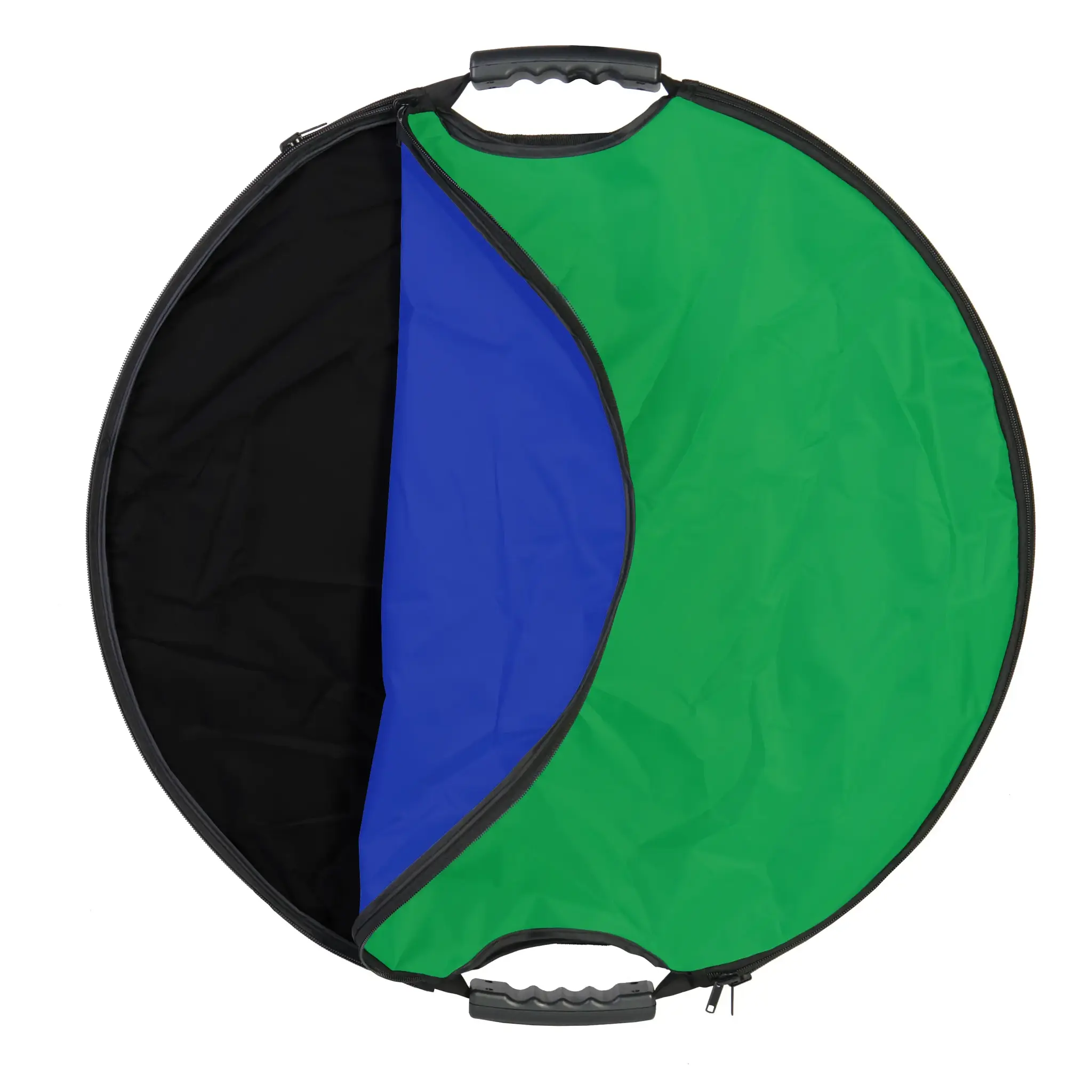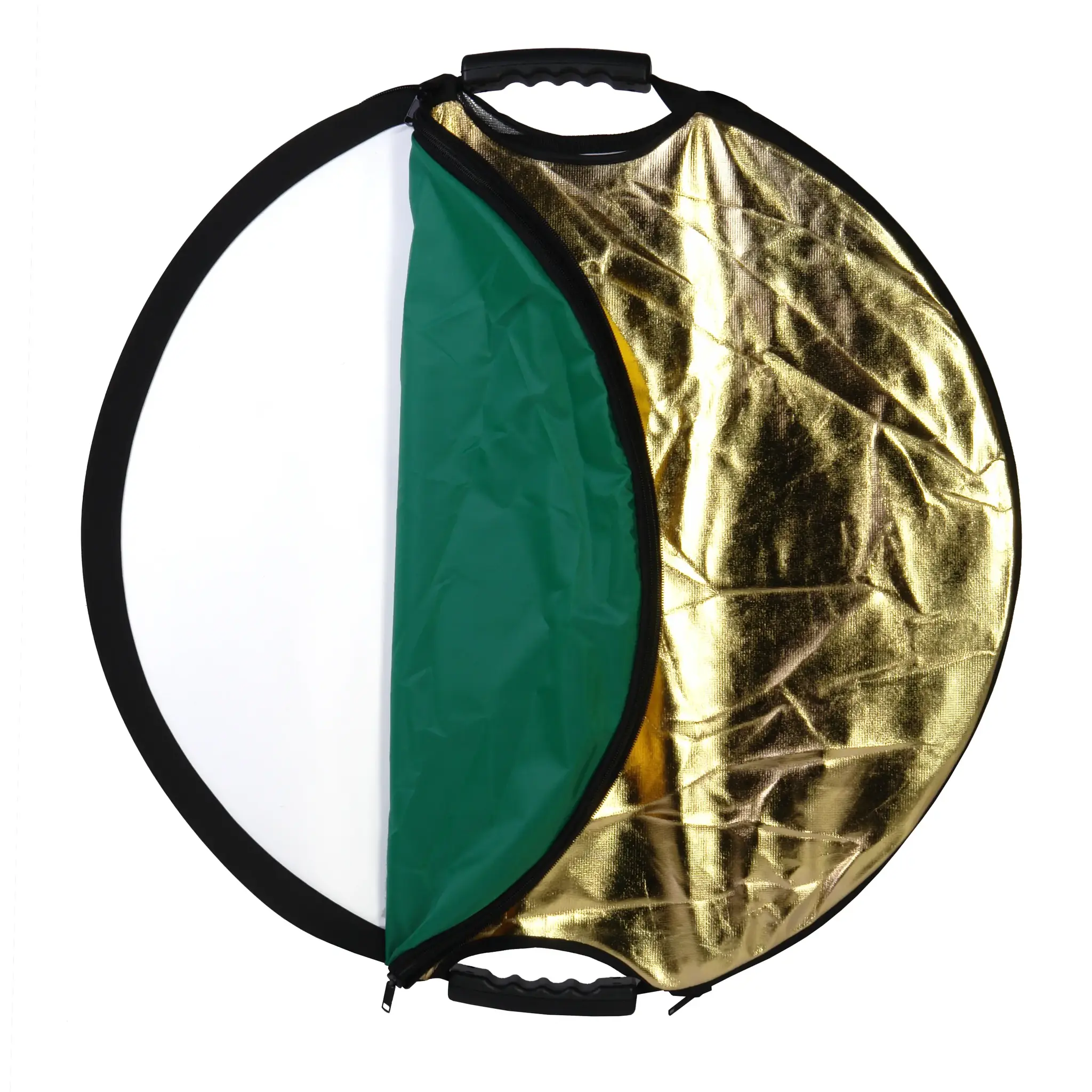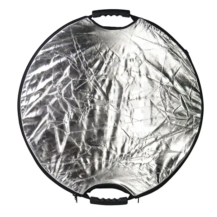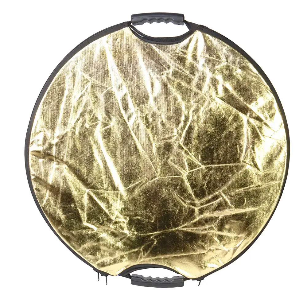 Круглый отражатель 7 в 1: золотистый/серебристый/белый отражающий/ белый просвечивающий/черный/зеленый/синий. Диаметр 56 см. Используется в предметной и портретной съемке, а также для подсветки участков кадра.