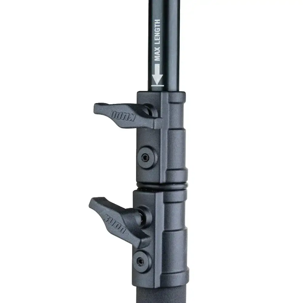 Сверхпрочная четырехсекционная телескопическая перекладина может достигать длины от 1,17 м до максимальной длины 3,05 м и выдерживать нагрузку до 3,6 кг, что особенно удобно для мобильного размещения осветительных приборов на локации. На каждой секции, изготовленной из алюминия, нанесена маркировка предельной длины, а для надежной регулировки длины предусмотрены большие стопорные рукоятки.