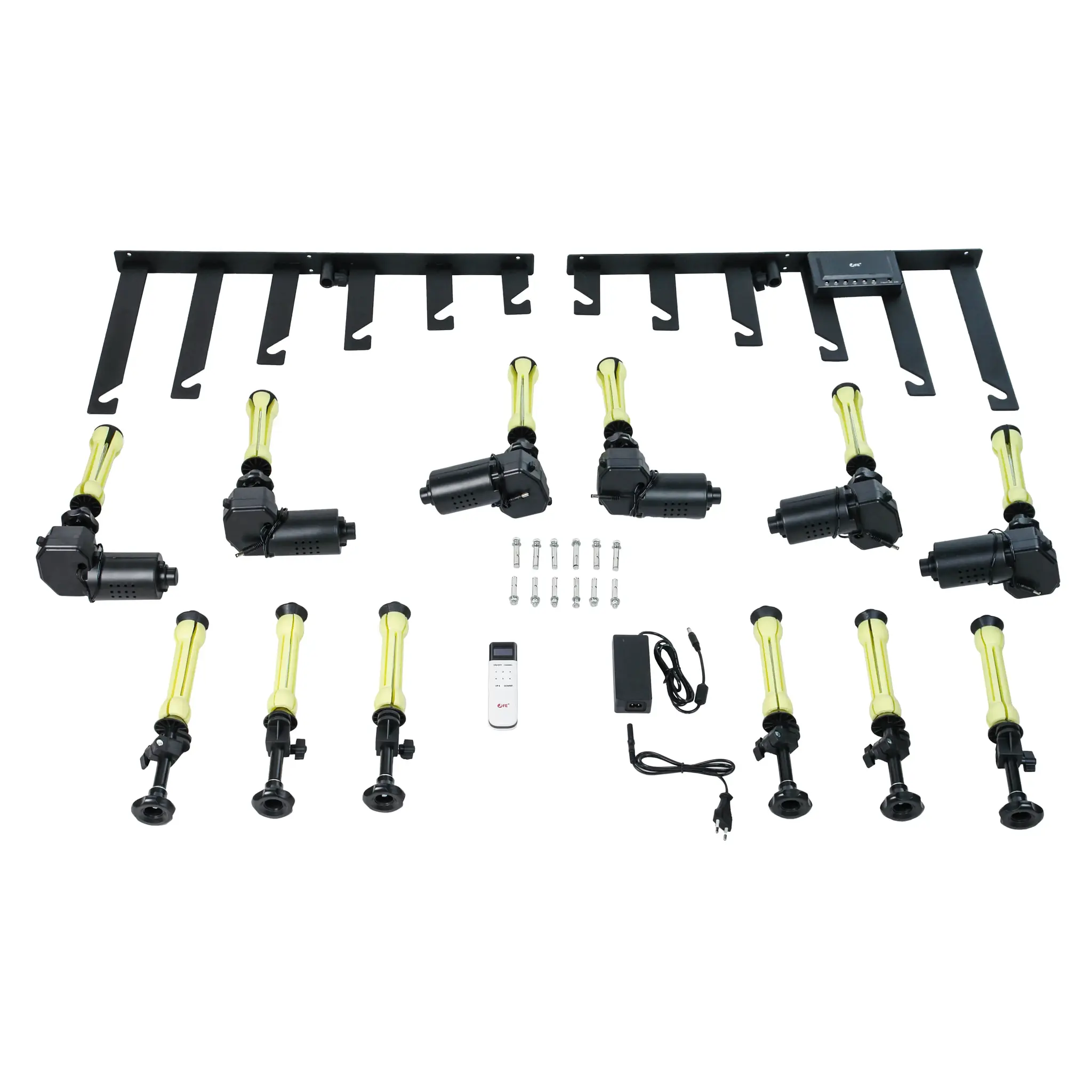 Приемник, расположенный на одном из кронштейнов, получает сигнал от пульта и передает его на подключенные проводами питания моторы. При сопряжении с пультом ДУ приемник издает звуковой сигнал, что существенно упрощает настройку подъемника. Дистанция эффективного соединения составляет до 20 м.Универсальный пульт на 6 моторов может управлять выбранным подъемником на одном из 18 каналов или одновременно несколькими моторизованными фоновыми подъемниками.