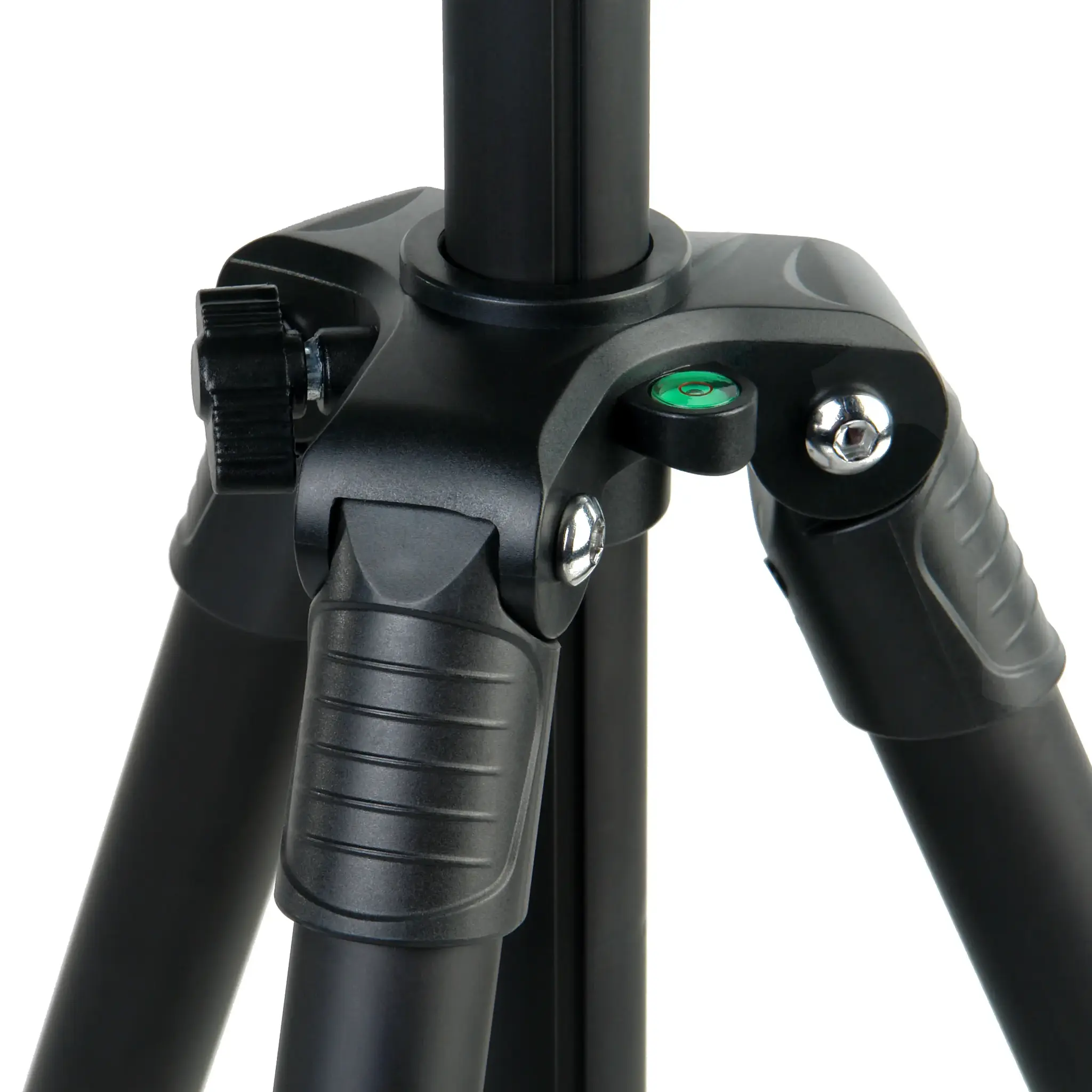 4 секции треноги из алюминиевого сплава соединены клипсовым зажимами из прочного пластика. Положение ног жестко зафиксировано за счет растяжки, наличие которой гарантирует устойчивость всей конструкции. Резиновые наконечники ног трипода защищают поверхность, на которую установлен штатив, от повреждений.