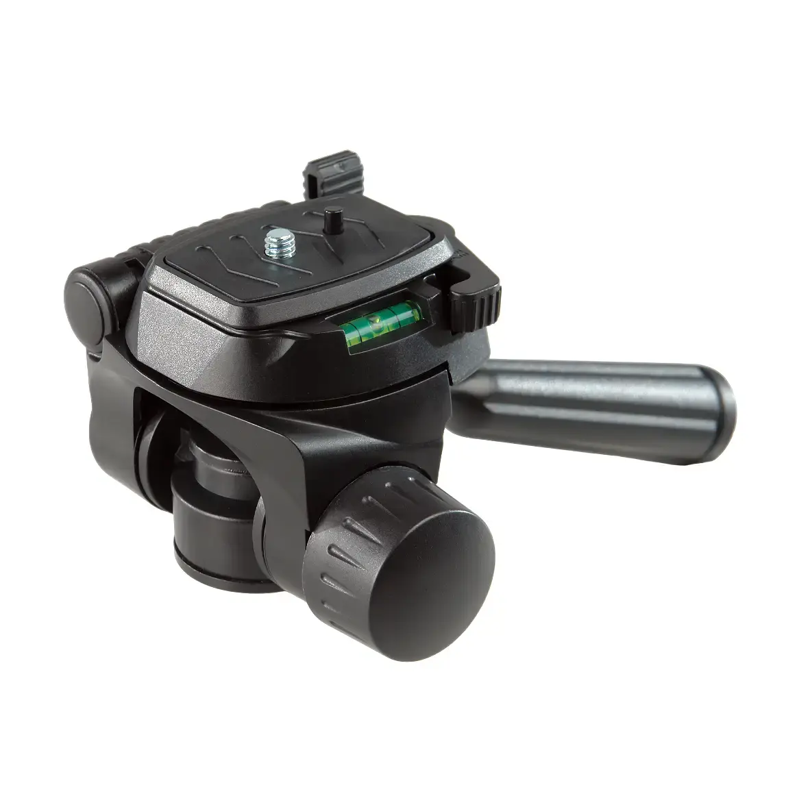Головка обеспечивает плавное свободное движение в трех плоскостях – вертикальное панорамирование в пределах -30°/+90°, горизонтальное панорамирование на 360° и поворот площадки на 90° для вертикального/горизонтального позиционирования камеры. Угол наклона регулируется съемной рукояткой длиной 15 см, для точности настроек с левой стороны предусмотрен пузырьковый уровень.