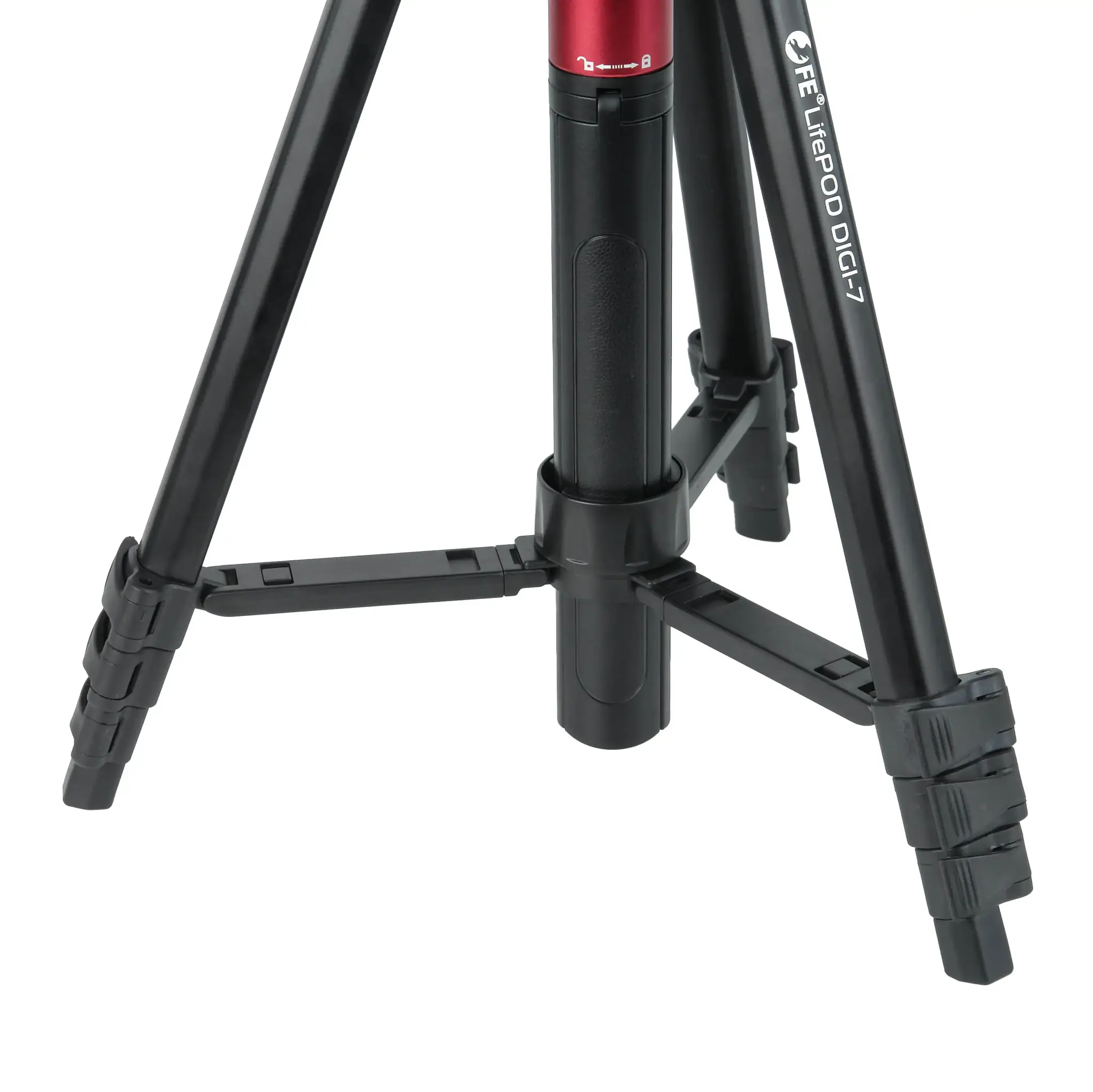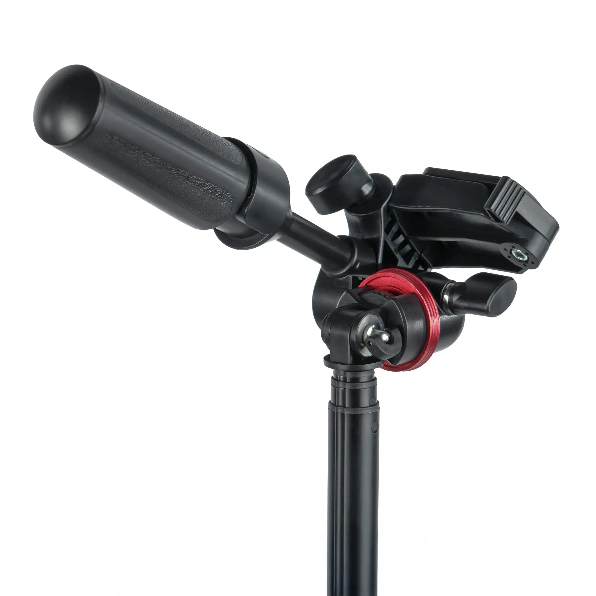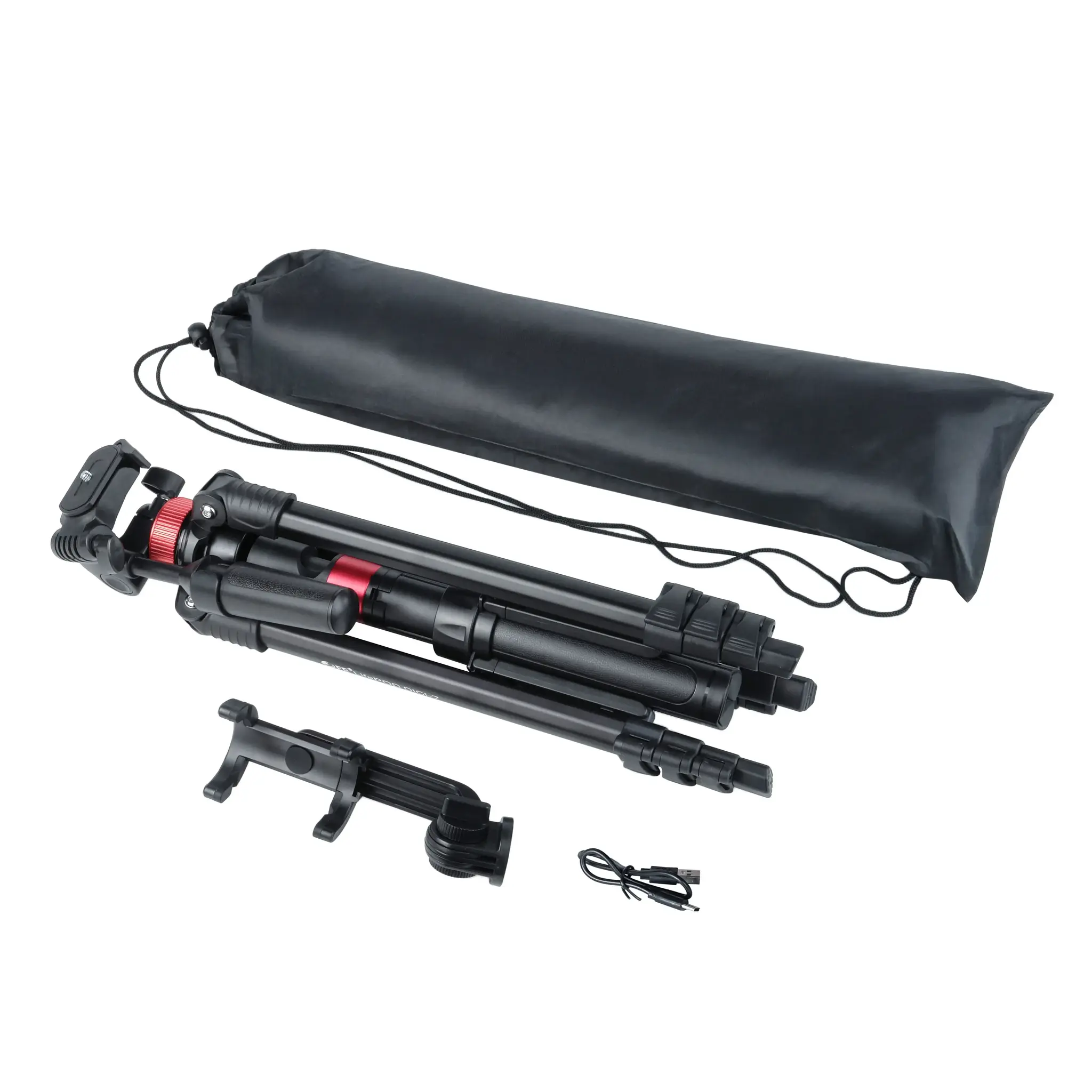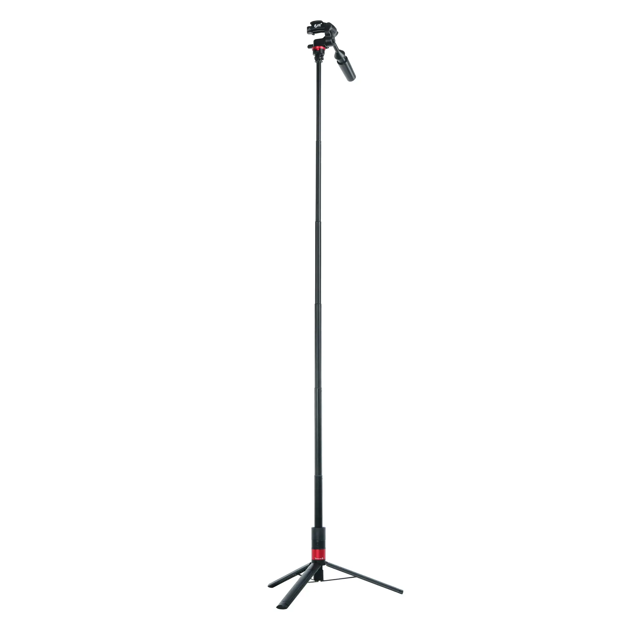 Легкий штатив 2в1: штатив + монопод (селфи-палка), нагрузка до 1.5 кг, 4 секции, высота 42-233 см, верхняя телескопическая растяжка, 3D головка (панорамирование 360°, наклоны -60°...+90°), быстросъемная площадка с винтом 1/4", пузырьковый уровень, регулируемый держатель (ширина 56–95 мм), селфи-кнопка с кабелем зарядки, чехол. Алюминиево-пластиковый корпус, вес 1,16 кг.