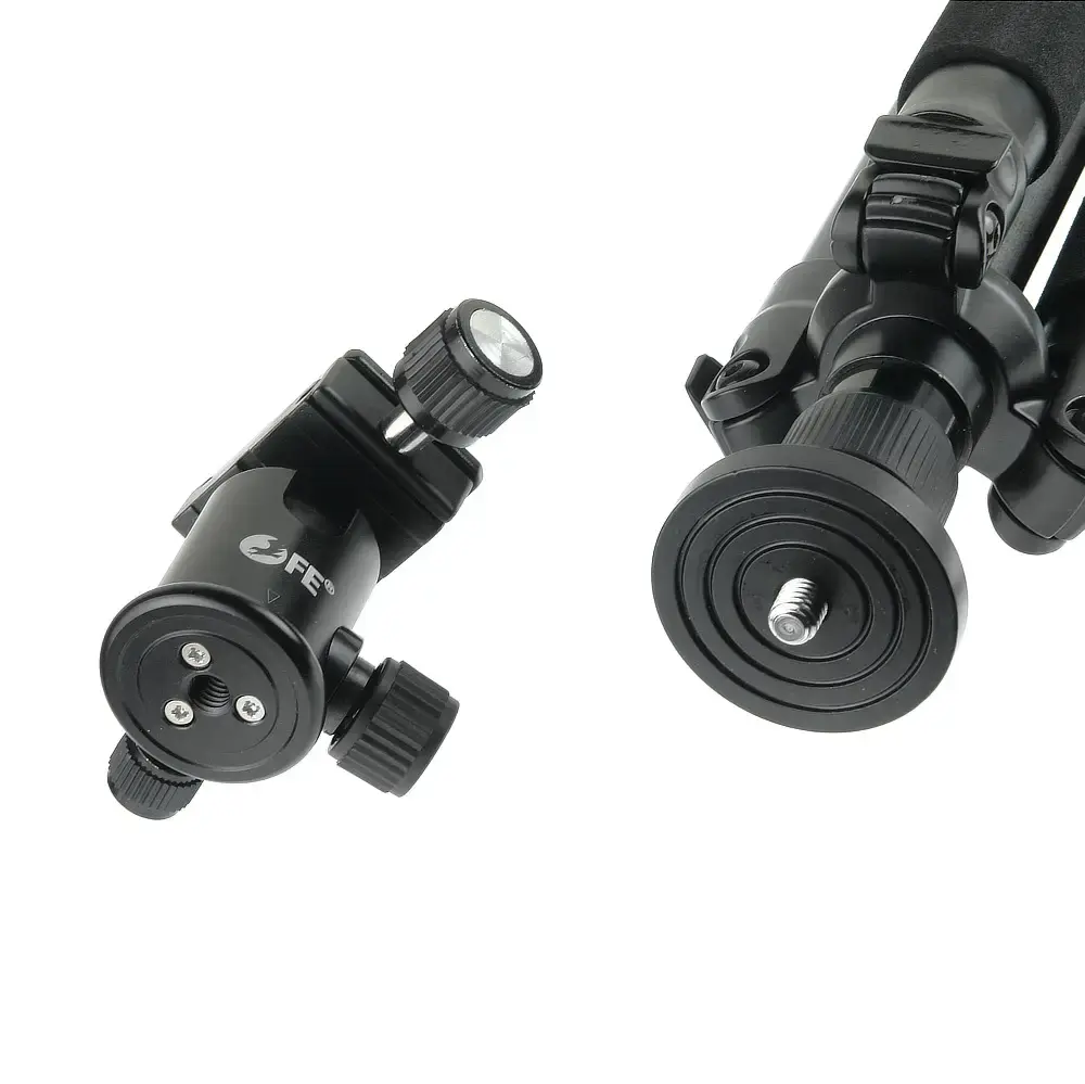 Плавно поворачивать камеру на 360° вокруг своей оси позволяет шаровая штативная голова, установленная на платформу со шкалой для горизонтального панорамирования. Голова сменная, выполнена из алюминиево-магниевого сплава. Регулировочный винт помогает надежно зафиксировать ее в нужном положении. Шаровая конструкция с вертикальным пазом дает возможность изменять наклон площадки с камерой в пределах –90 до +45°. Быстросъемная площадка оборудована винтом 1/4” для установки оборудования и предохранителем от случайного перемещения.