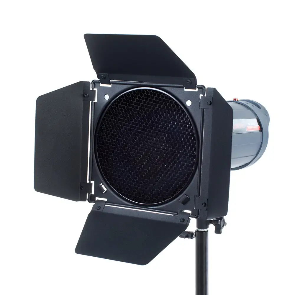 Шторки ограничивают световой поток и позволяют настроить освещение в соответствии с требованиями фотографа. Изготовлены из металла. Посадочный диаметр 175 мм, комплект совместим с любыми рефлекторами размером 7″.