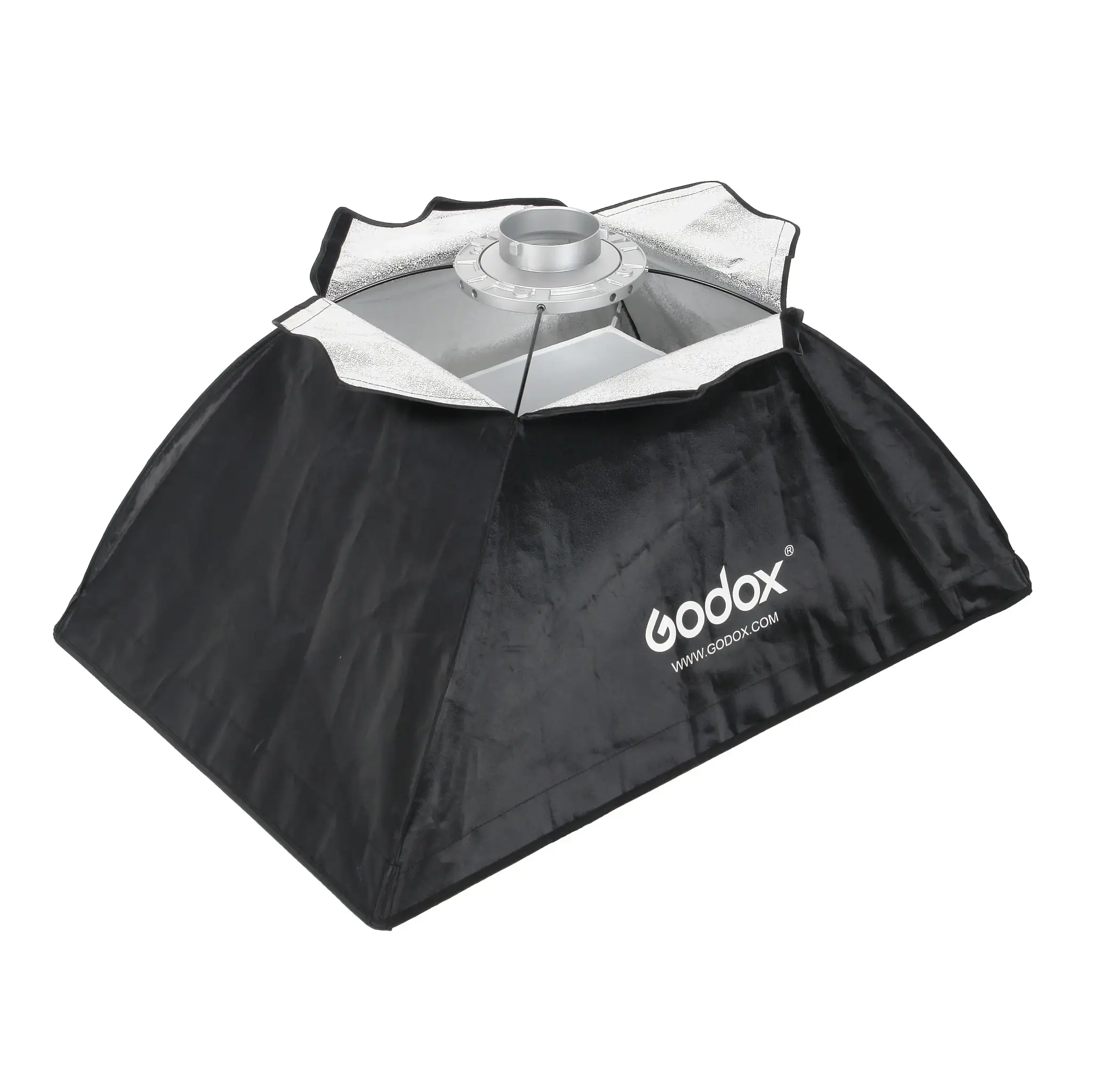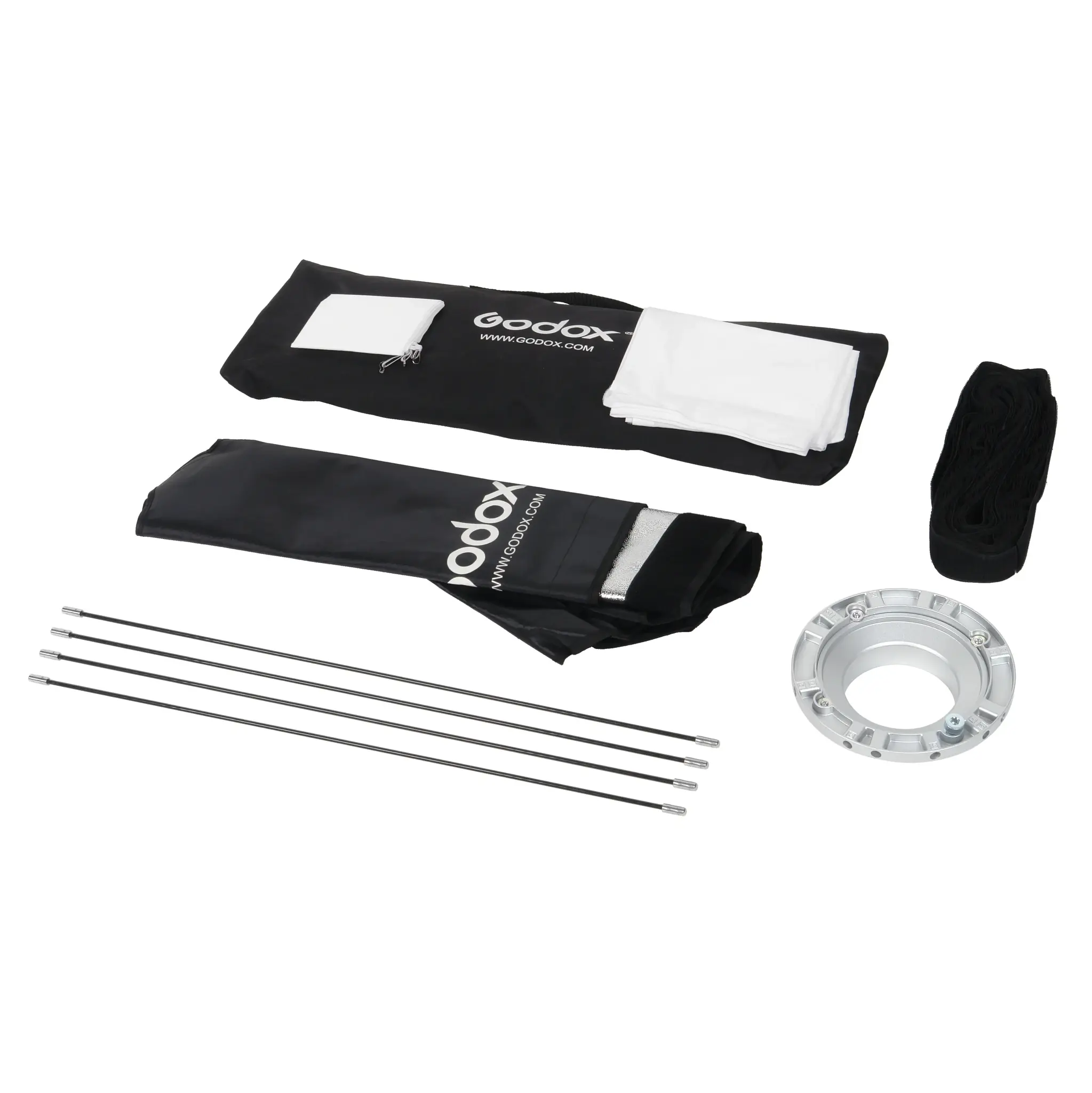Софтбокс состоит из отражателя, внешнего и внутреннего рассеивателя, несущего каркаса (литой алюминиевый адаптер и сменное байонетное кольцо на Bowens). Для установки Godox SB-FW6090 на студийные вспышки с другим байонетом можно использовать переходные кольца.