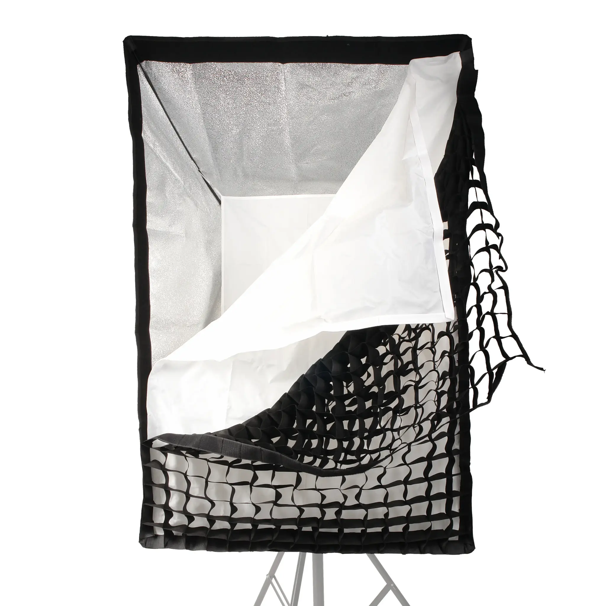 Закрытая конструкция исключает паразитные блики и потери светового потока. Отражающая серебристая поверхность обеспечивает равномерное распределение света внутри софтбокса, белые полупрозрачные рассеиватели делают свет более мягким.