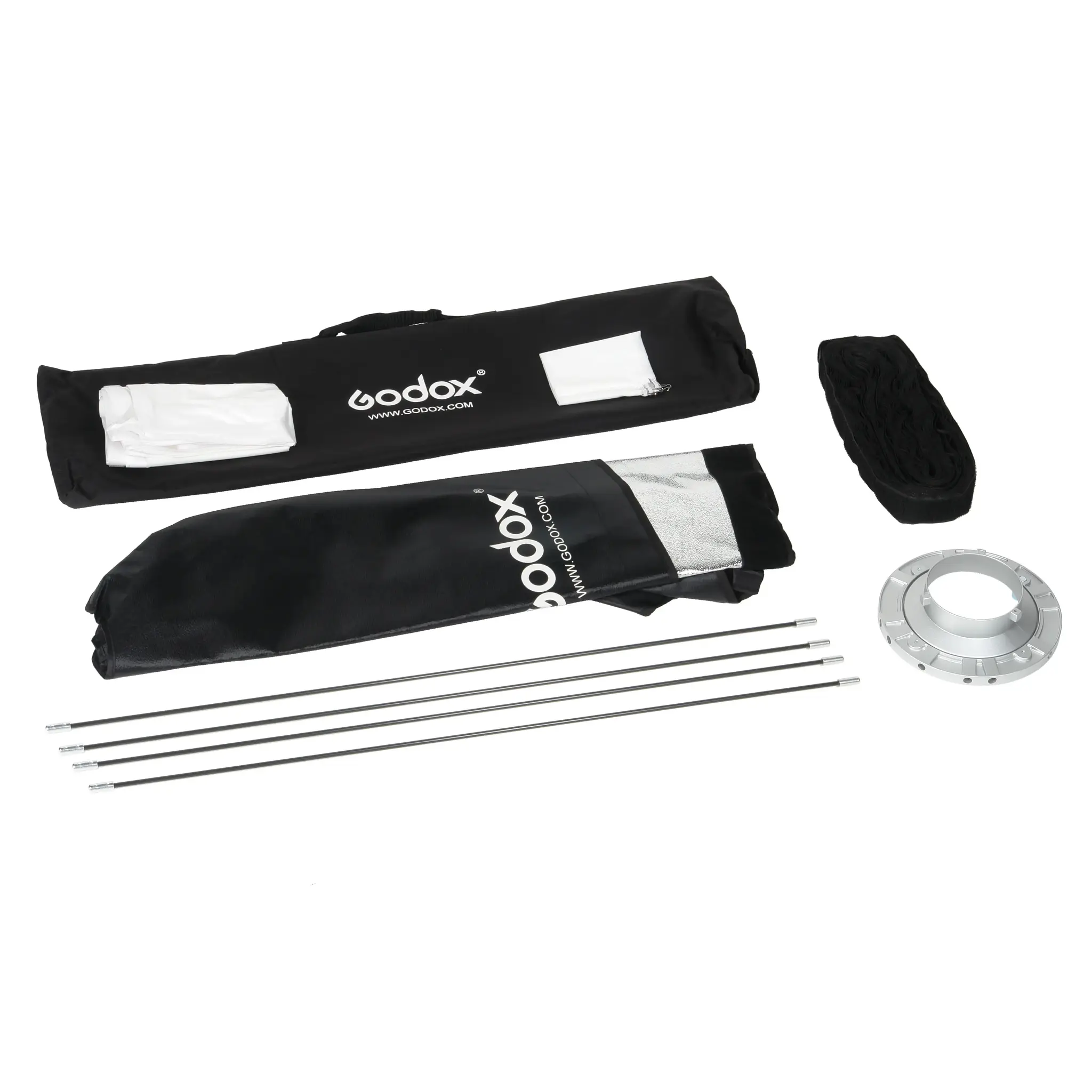 Тент софтбокса SB-FW80120 – 1 шт , Спицы — 4 шт , Кольцо-адаптер Bowens (сменное) – 1 шт , Тканевые рассеиватели – 2 (внутренний и внешний) , Тканевые соты — 1 шт , Чехол – 1 шт , Гарантийный талон