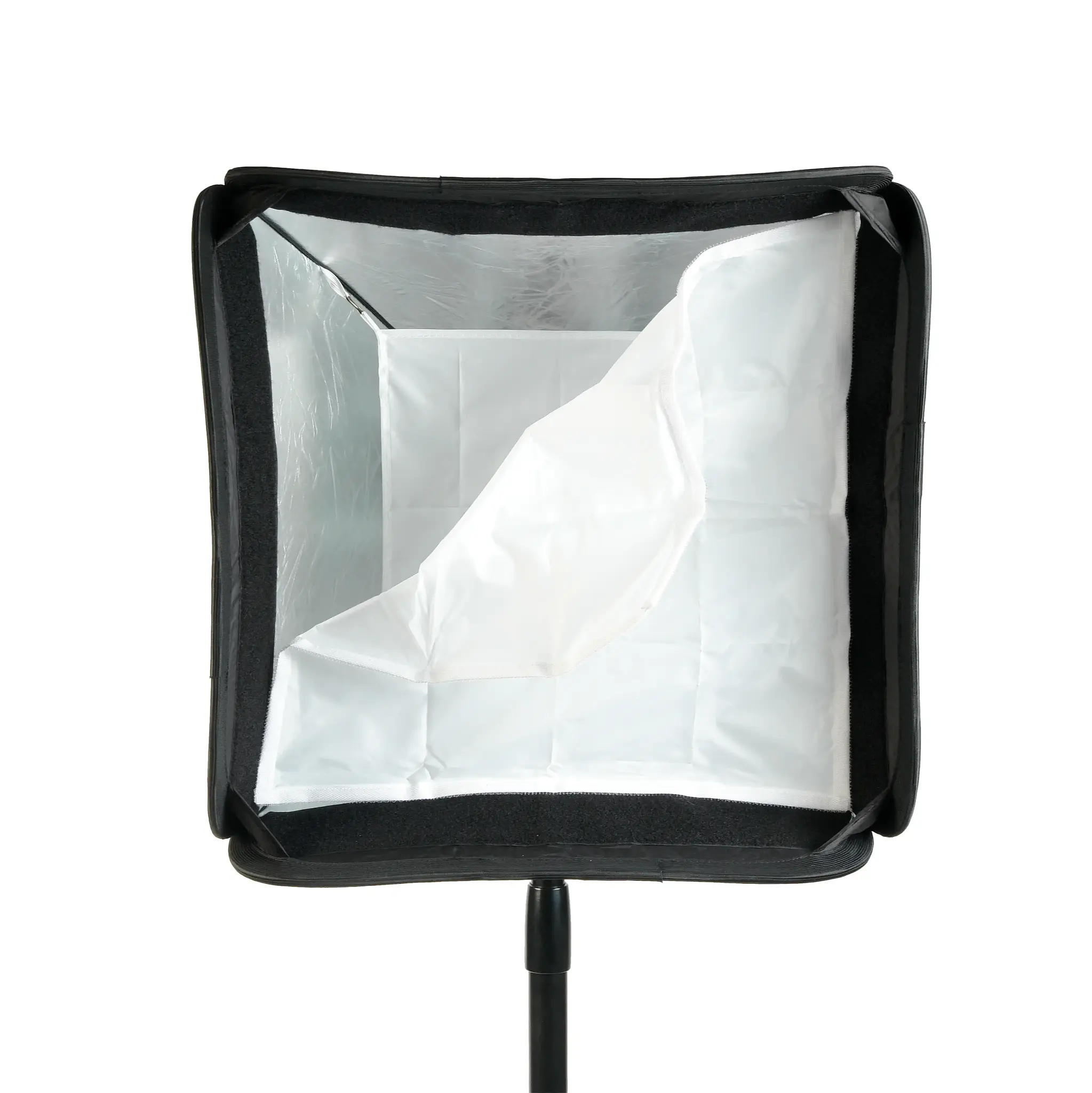 Два рассеивателя (внутренний и внешний) помогают получить мягкий и равномерный световой поток. По периметру софтбокса находится липучка, на которую крепятся тканевые соты.