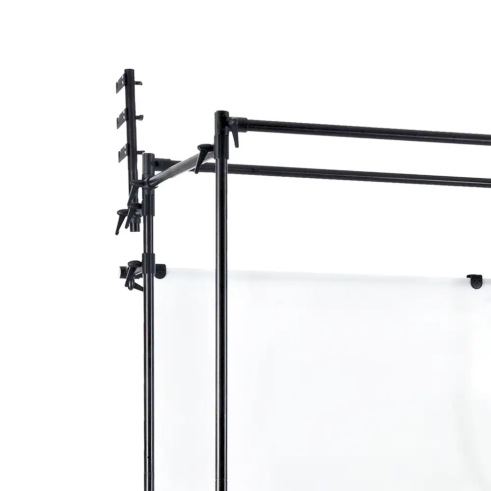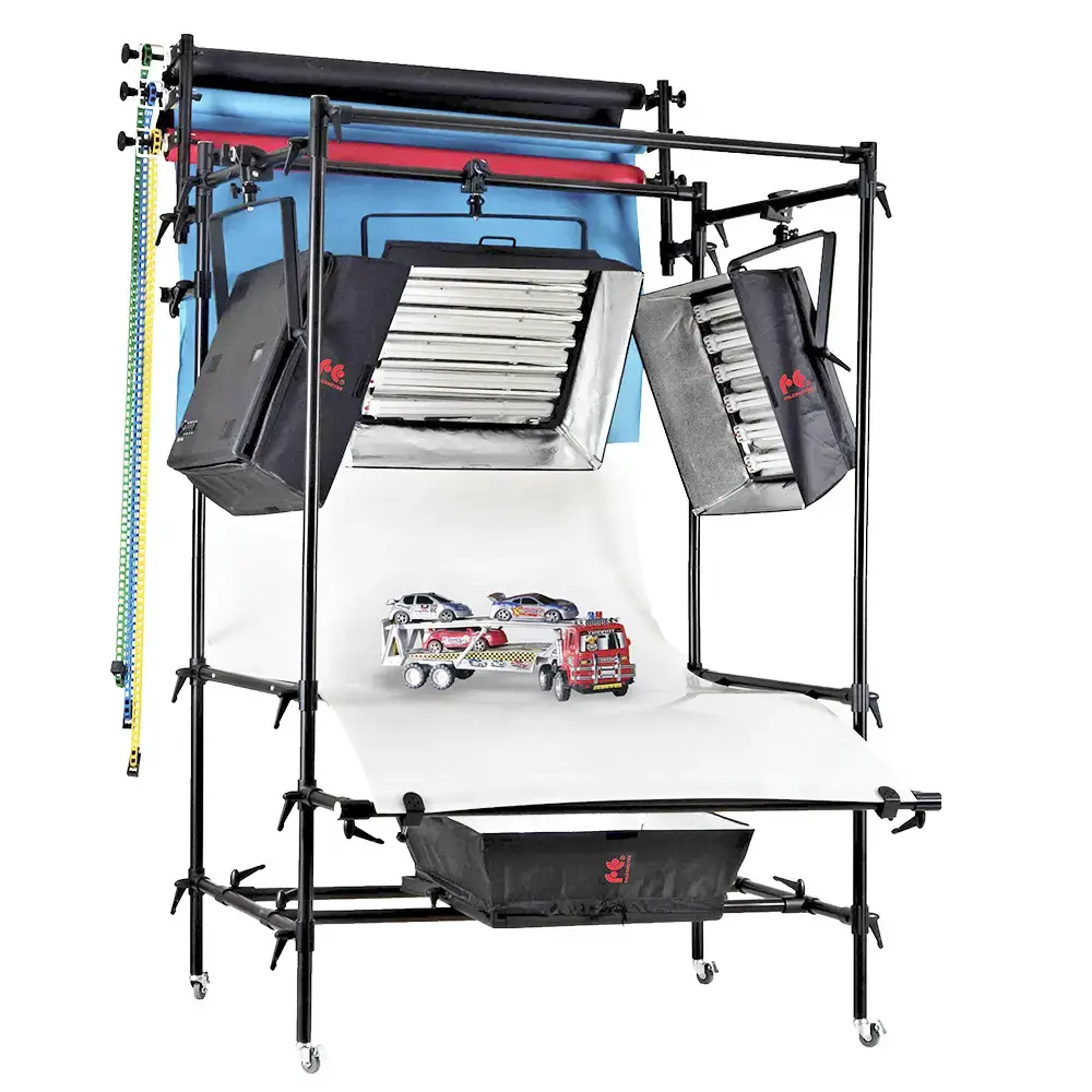 На ножках стола установлены колеса со стопорами, это обеспечит мобильность конструкции и устойчивость при съемке.На каркасе размещены специальные консоли-держатели фона, на них устанавливается система подъема фонов намотанных на картонную тубу (фоны и система подъема приобретаются отдельно).