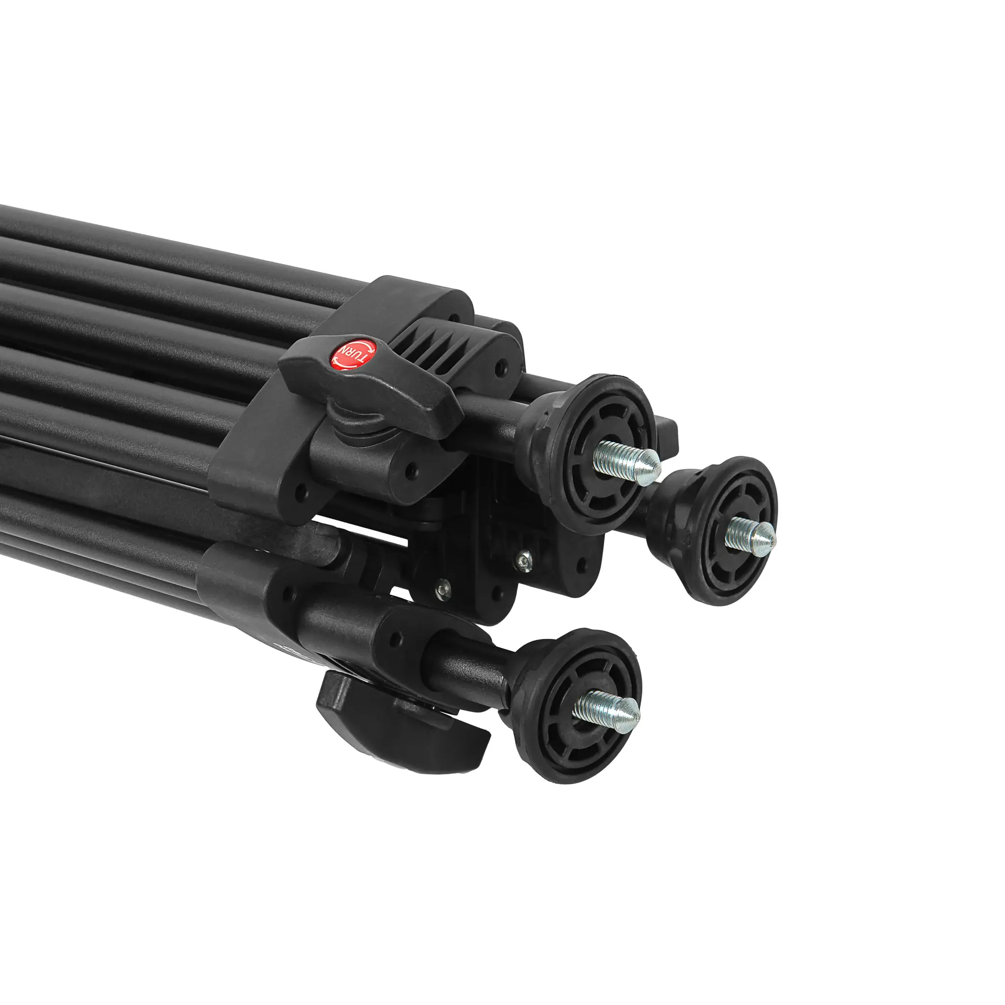 Алюминиевый трипод штатива представляет собой 3-секционную рамочную конструкцию с ногами из легких трубок Ø18 и 14 мм. Секции опор независимо выдвигаются и фиксируются винтовыми зажимами, что дает возможность устанавливать штатив на неровной поверхности. Нижние секции ног оканчиваются винтовой резьбой с шипами, на которые накручиваются резиновые опоры с шарнирной базой для контакта с поверхностью. Резиновые опоры обеспечивают устойчивое сцепление с гладким полом, а шипы – с грунтом. Высота штатива регулируется от 82 до 176 см, в сложенном виде длина штатива – 84 см.