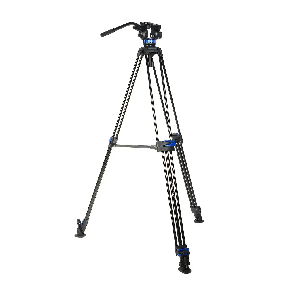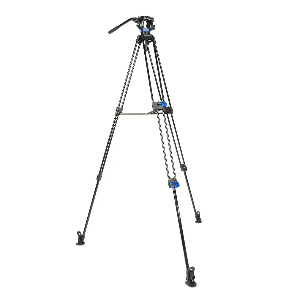 Складные ножки рамочной конструкции подавляют вибрацию, исключая колебания камеры, в том числе при вертикальном и горизонтальном панорамировании. Выполнены из алюминиевых трубок диаметром 15 и 20 мм, не подвержены коррозии. Каждая ножка регулируется отдельно, с учетом особенностей рельефа. Три секции ноги надежно фиксируются клипсовыми зажимами. Высоту штатива можно регулировать с 91 до 185 см. Усиливает жесткость конструкции верхняя поперечная растяжка. Штатив устойчив на твердом грунте или обледеневшей поверхности благодаря шипам на концах ног. Входящие в комплект резиновые опоры-башмаки обеспечивают хорошее сцепление с гладким полом. Точно расположить штатив относительно горизонта позволяет пузырьковый уровень.