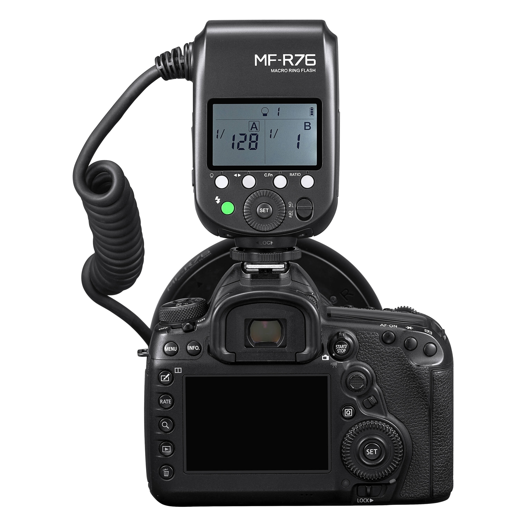 MF-R76 - кольцевая макровспышка в компактном корпусе, состоит из двух компонентов: контроллера, который вставляется в крепление «горячий башмак» DLSR-камеры, и кольцевой вспышки, которая крепится к объективу.