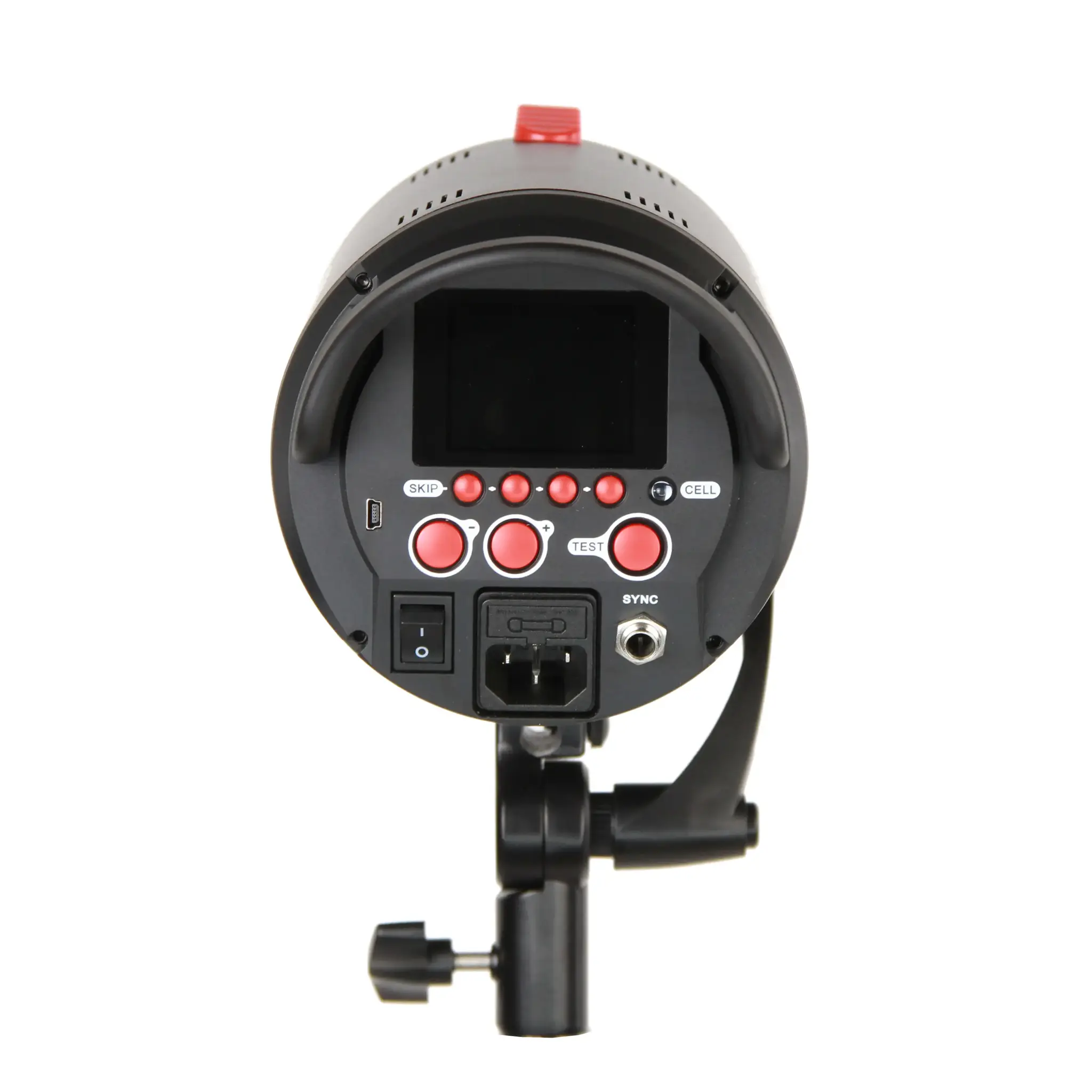 Панель управления расположена на задней стороне корпуса и состоит всего из 4 многофункциональных кнопок меню и 3 горячих кнопок большего размера – уменьшения мощности, увеличения мощности вспышки и кнопка «Тест». Установленные значения параметров и выбранный режим отображаются на большом ярком информативном дисплее.