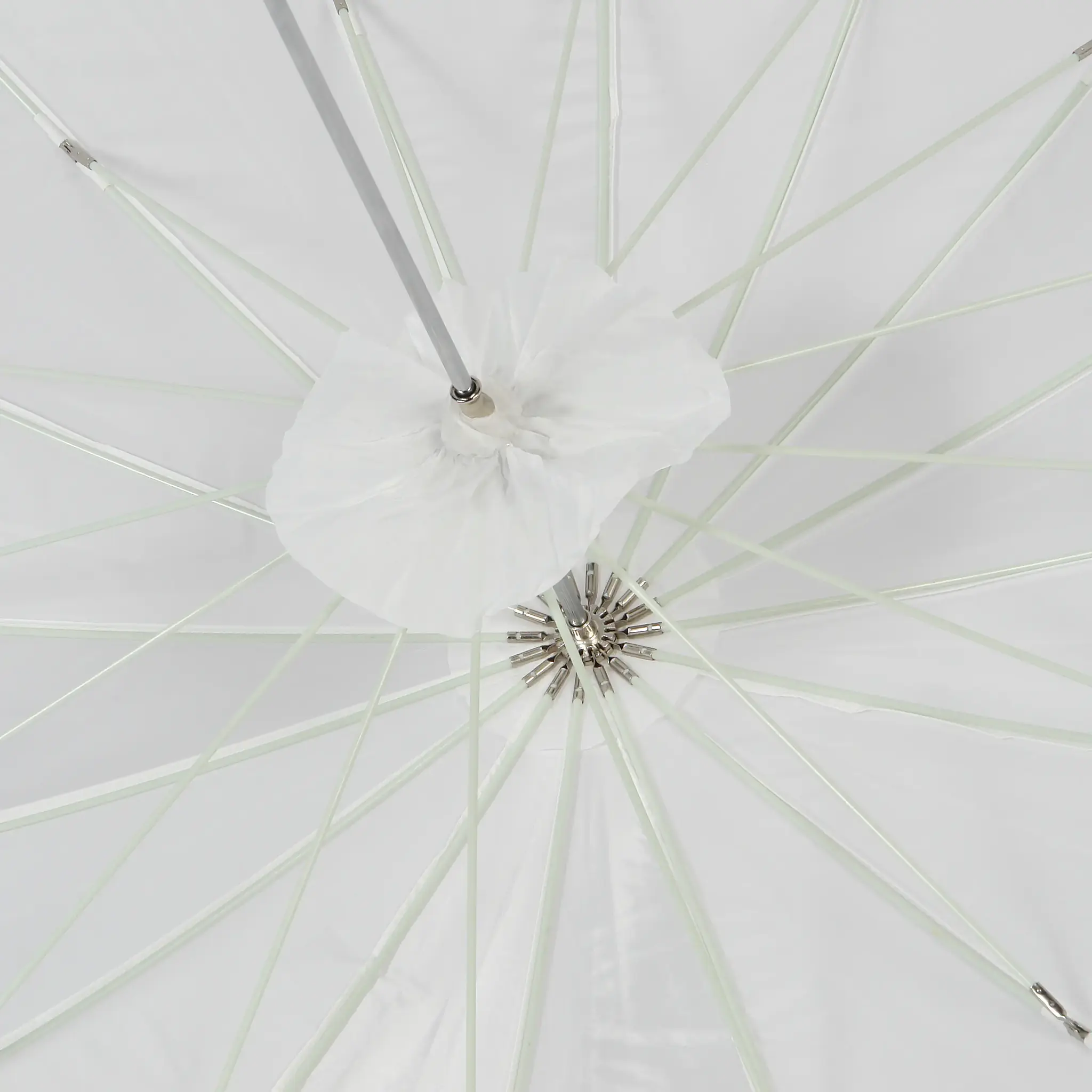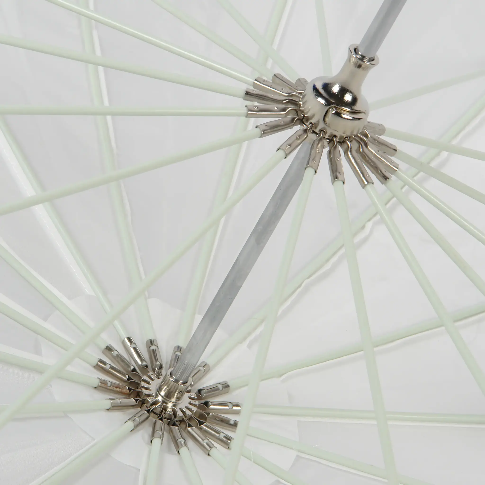 Зонт, обтянутый белой полупрозрачной тканью, используется для получения мягкого светового потока. Он преобразует точечный источник света за счет увеличения площади излучения. Попадая на поверхность зонта, свет рассеивается, равномерно освещая объект.